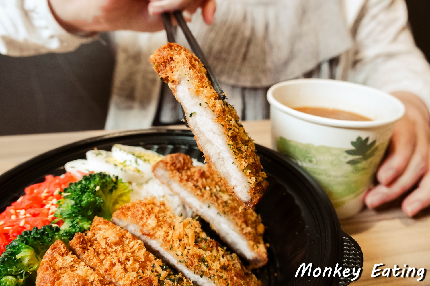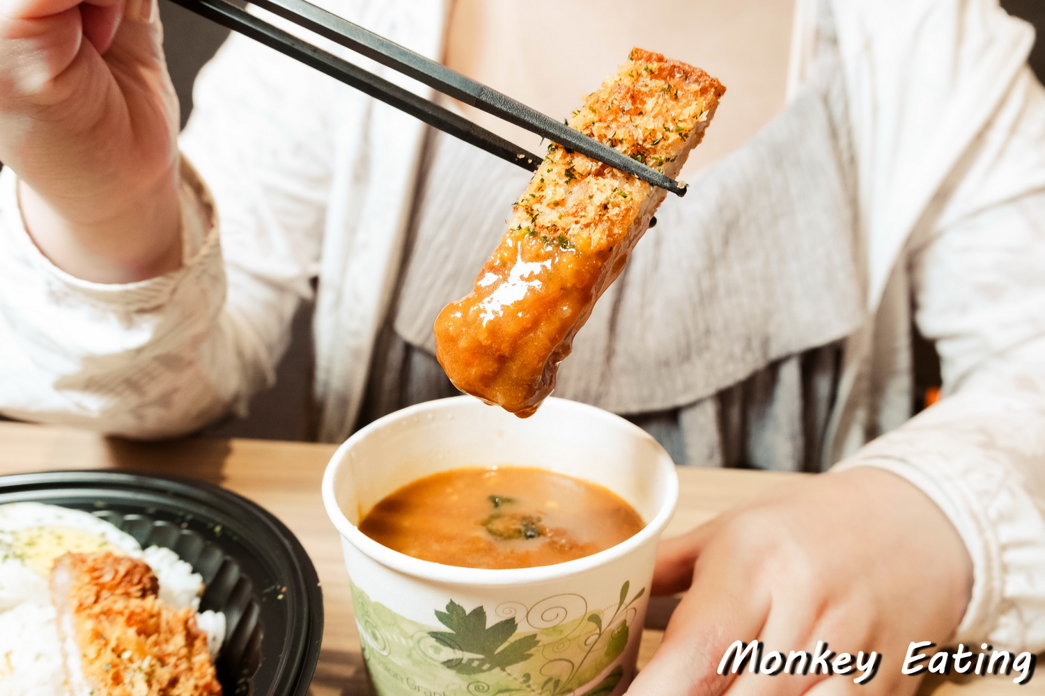炸豬排的表現也是可圈可點,帶有一定厚度,份量十足,外層炸得金黃酥脆,咬下去還能聽到「喀滋」的聲音,裡面的豬肉卻依然保有肉汁,軟嫩不乾柴。將酥脆的炸豬排沾上濃郁的咖哩醬一起吃,更是別有一番風味,兩種美味在口中交織,好吃到停不下來!