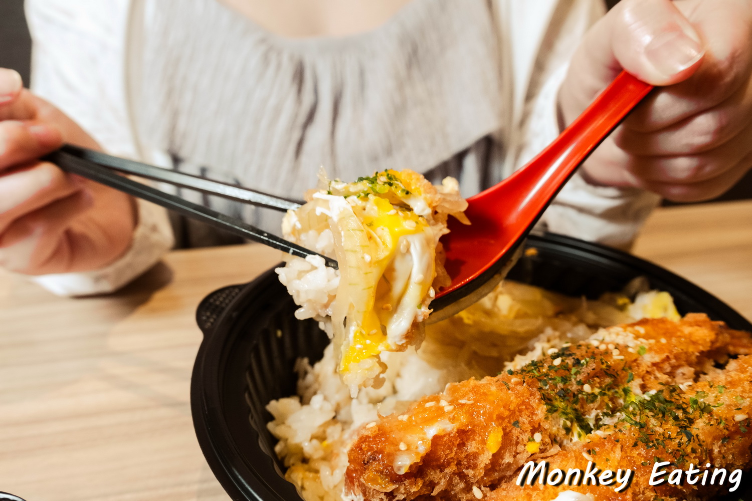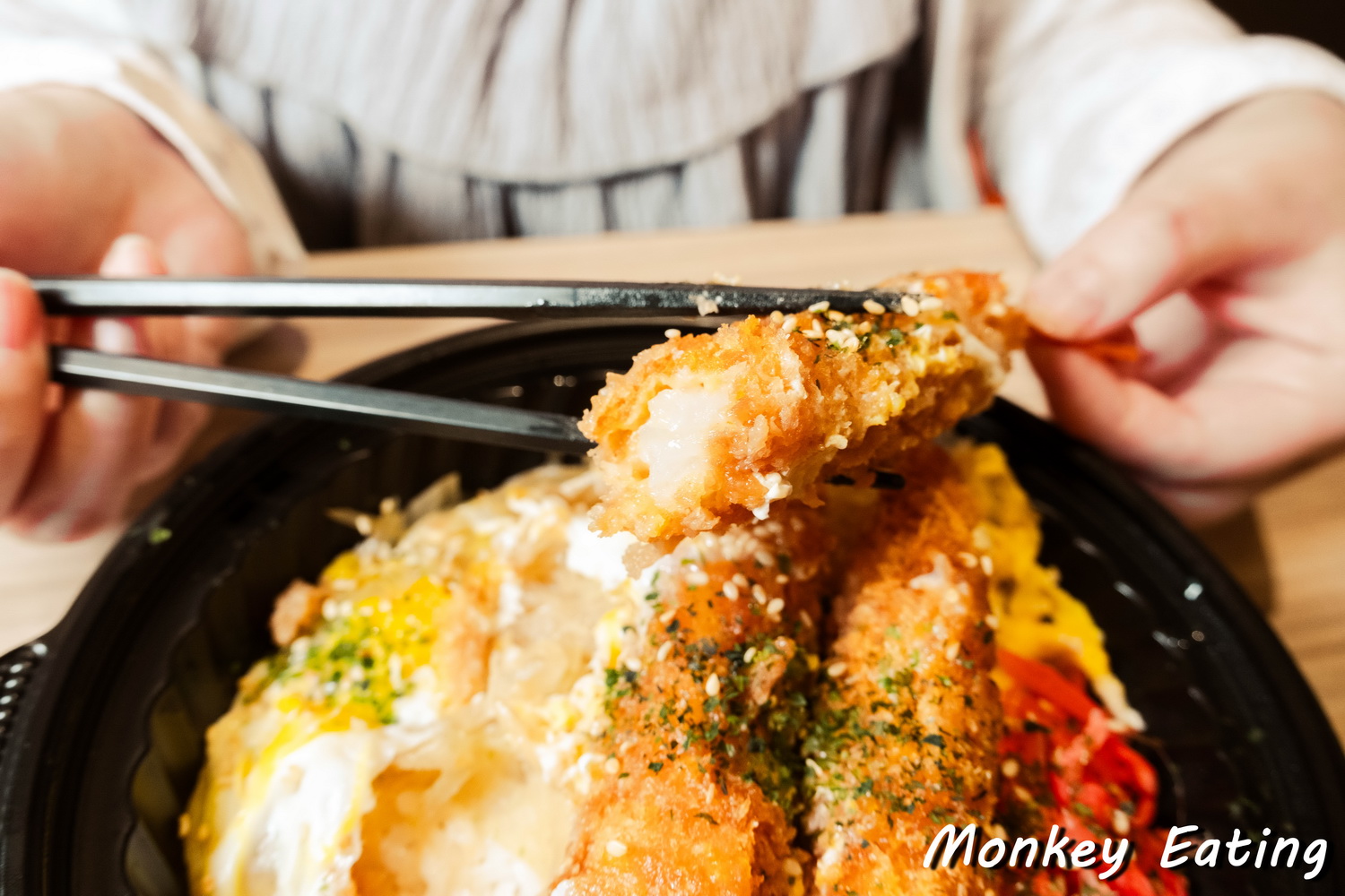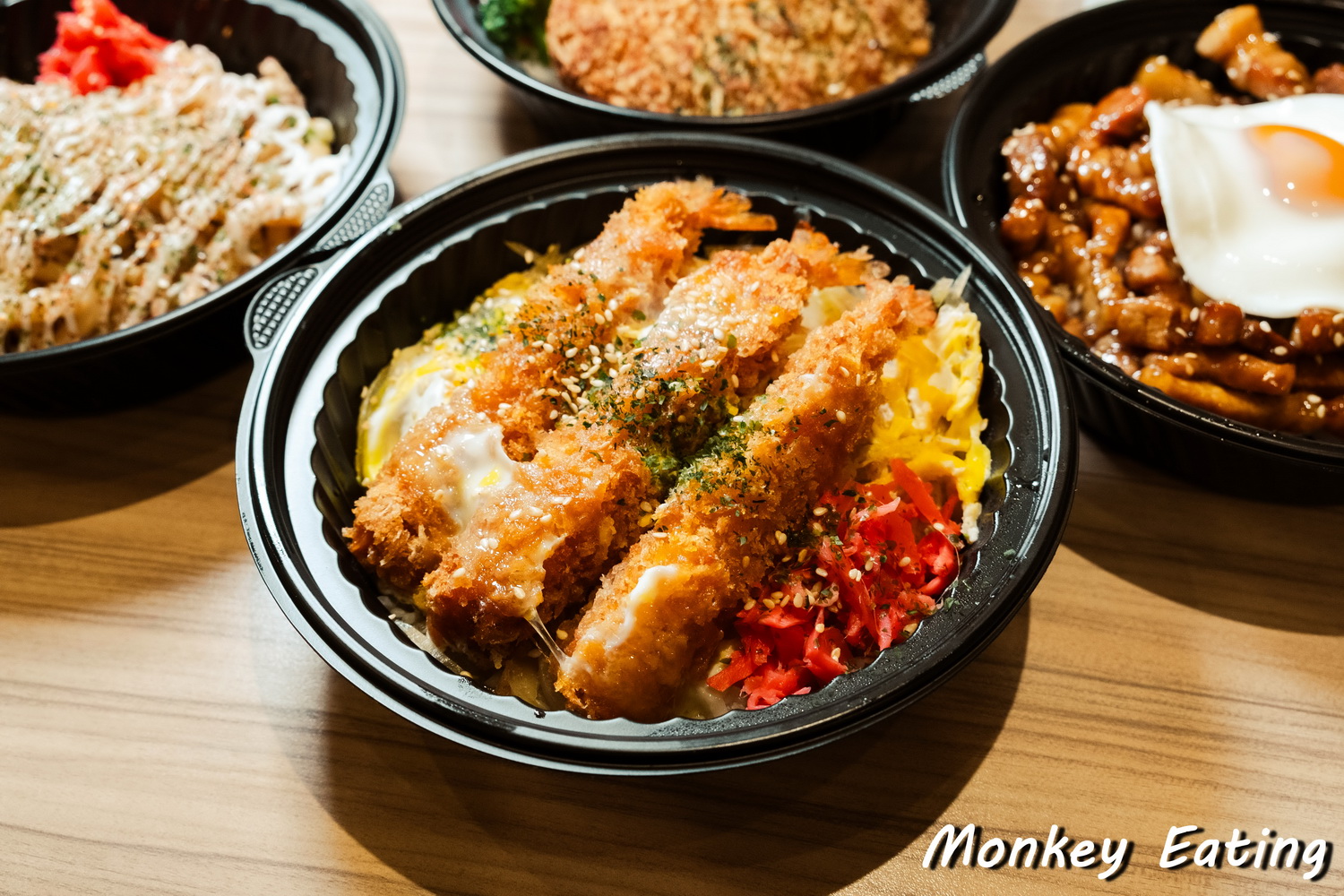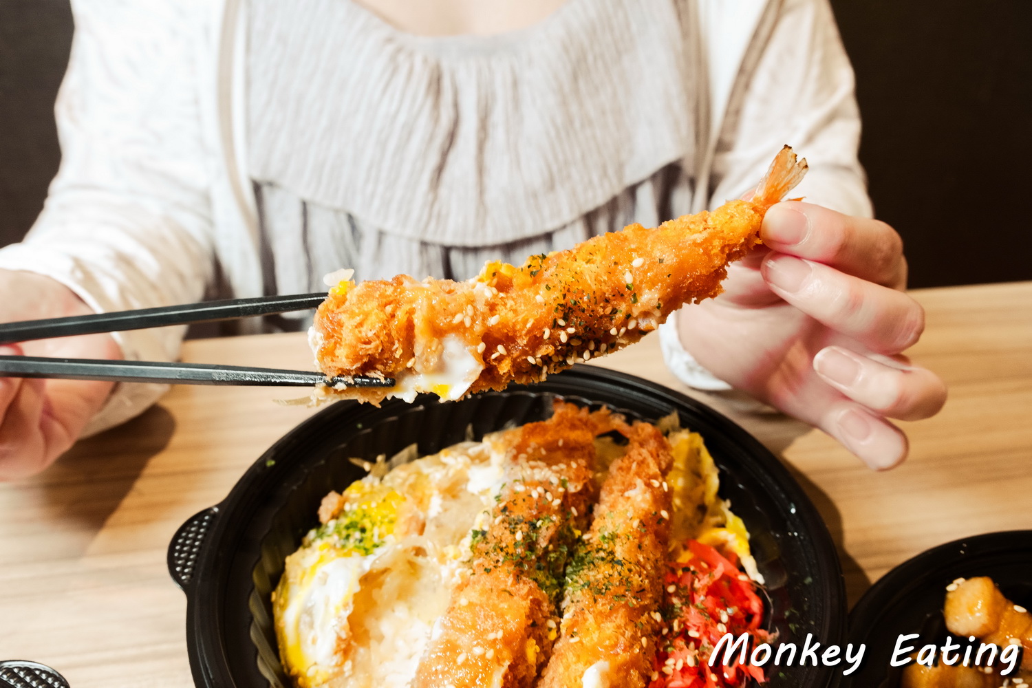 再來是這碗「滑蛋炸蝦井」,光是看到上面三隻大大的炸蝦,就覺得老闆誠意十足,給料超大方!