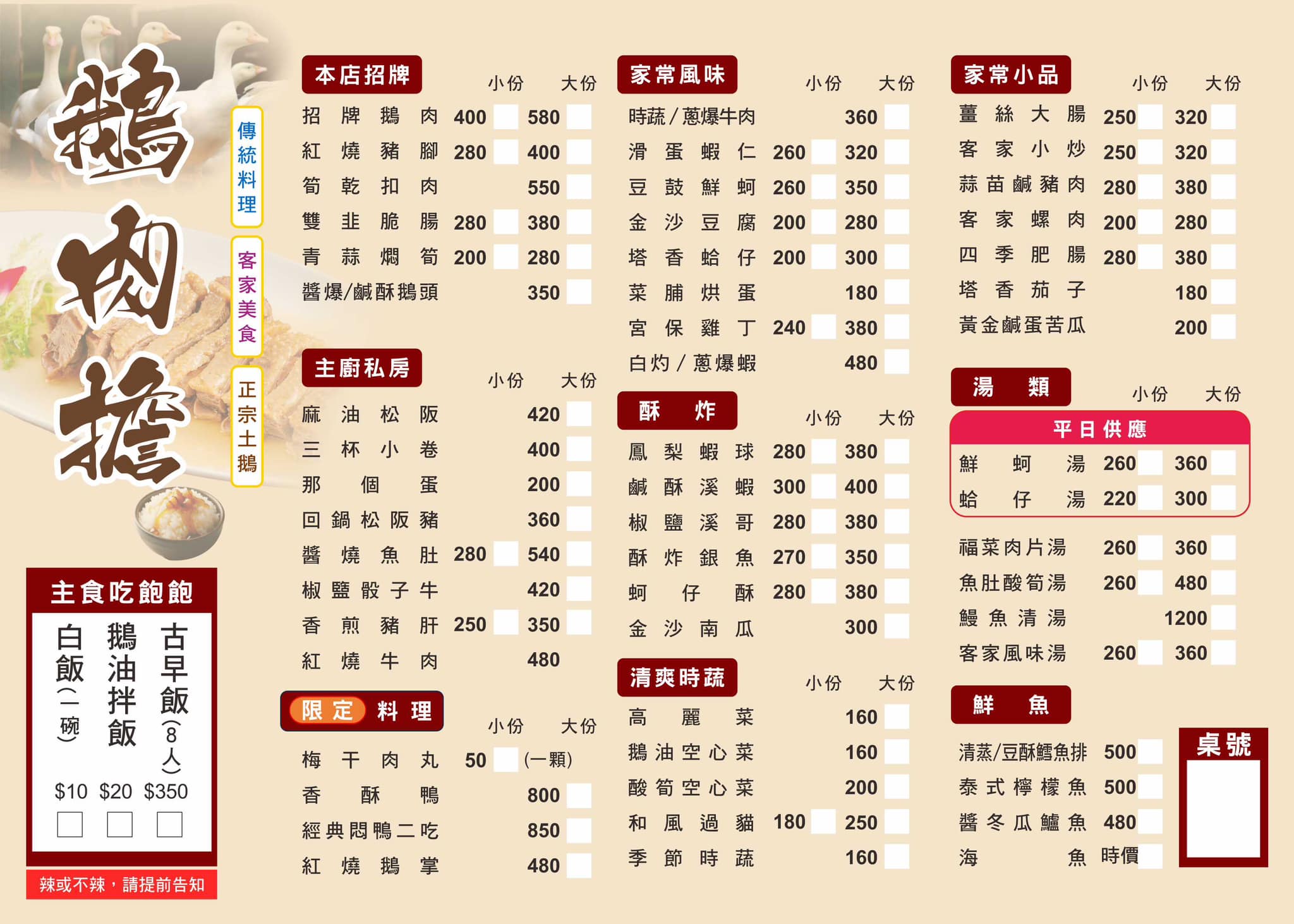 A: 這裡的空間規劃非常貼心!一樓用餐區寬敞舒適,適合小家庭或朋友小聚;二樓則有獨立包廂和大圓桌,非常適合家族聚餐、公司餐敘或朋友大型聚會,私密性高又熱鬧。 - Q: 除了鵝肉,還有哪些客家料理是鵝肉擔必點的?