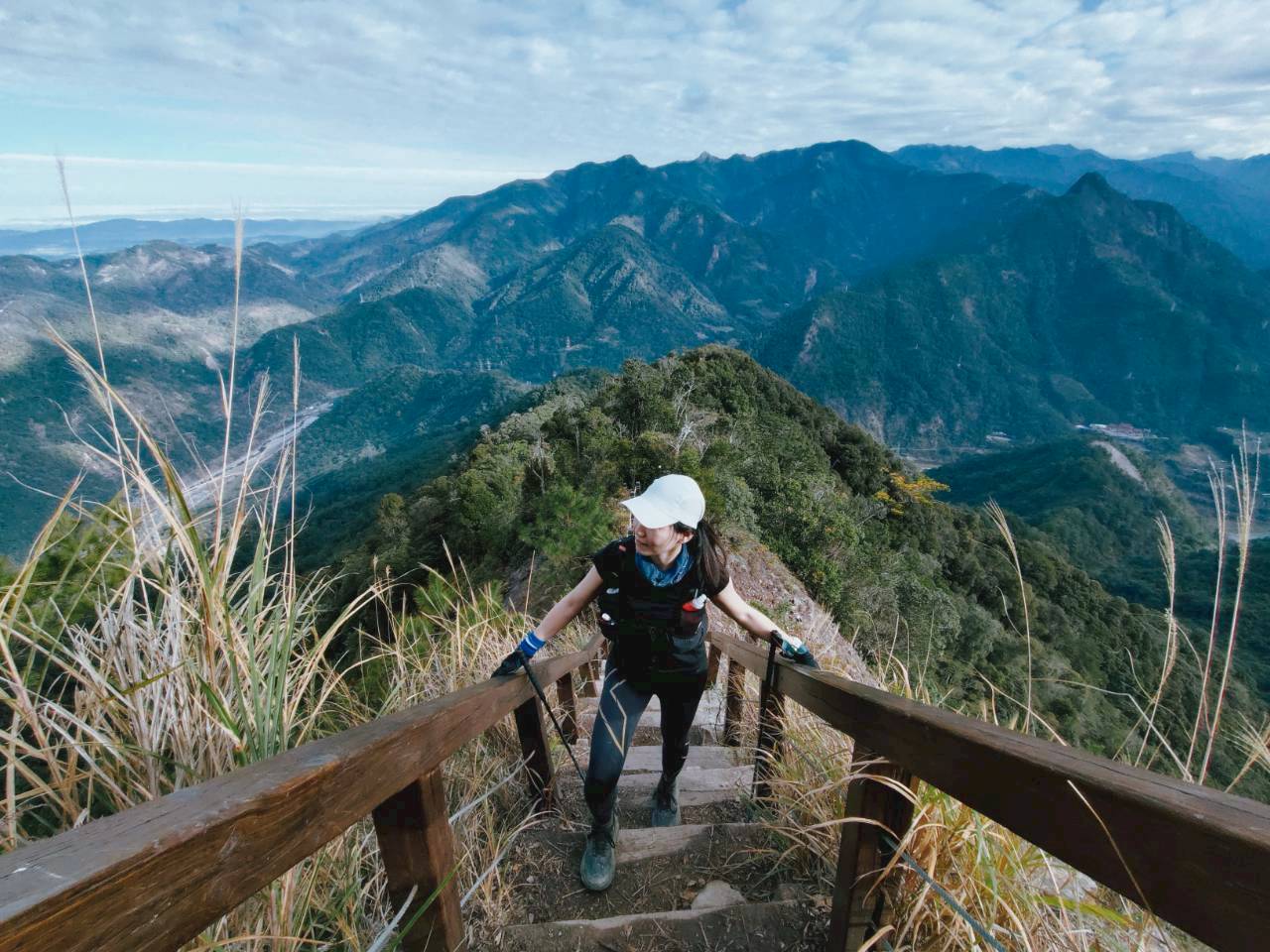 在接近白毛山三角點前,會遇到著名的「白毛山天梯」!這段幾乎垂直的木梯,是許多山友的打卡熱點,雖然有點吃力,但爬上去後回頭一望,景色超美,爽度瞬間破表!