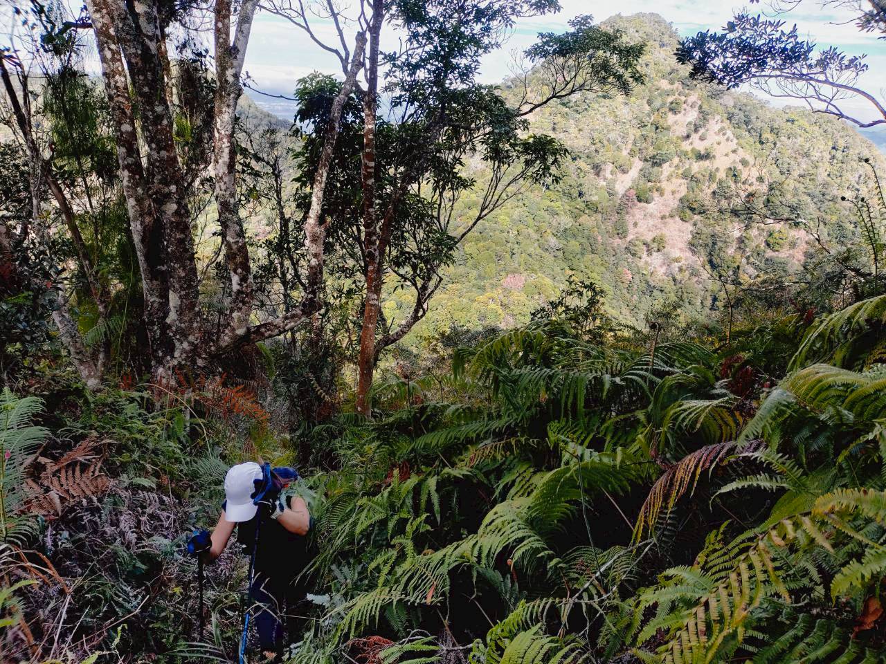 從太郎山下切到阿冷山前峰,這段路徑相當陡峭且濕滑,扎人的草也很多,每一步都要小心翼翼。阿冷山前峰海拔約1520公尺,是個重要的岔路口,往右直取阿冷山,往左則是下切往阿冷山登山口。