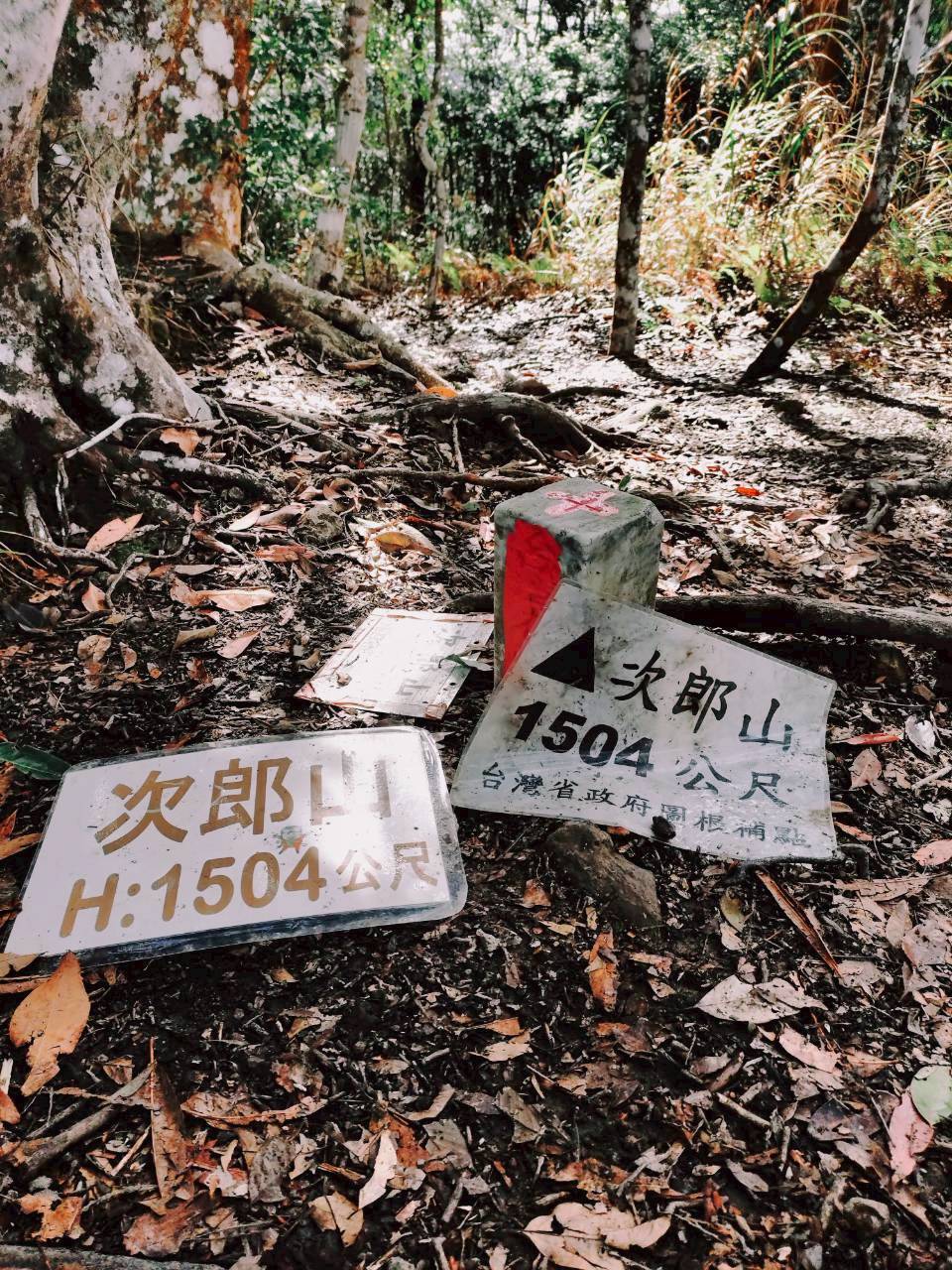 從白毛山到次郎山的路段,會先下切,然後再陡升。次郎山海拔1504公尺,有一個三角點基石。這裡的路徑較為濕滑,部分路段需拉繩輔助。