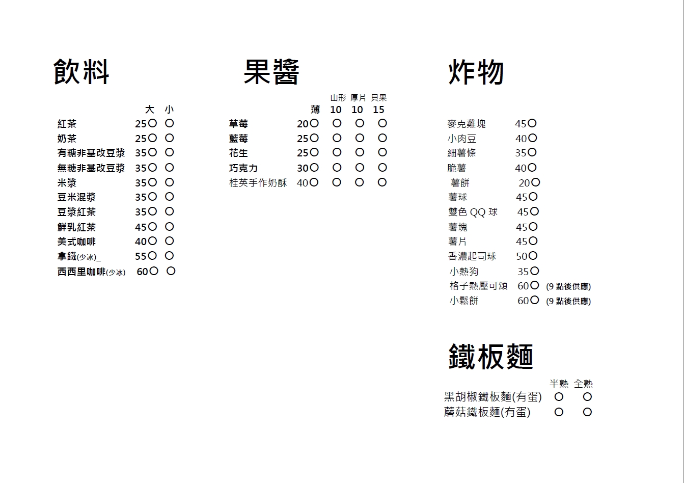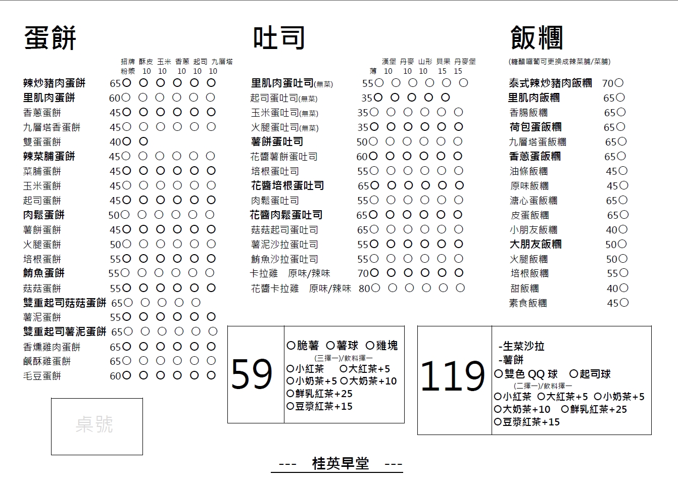 桂英早堂的菜單選項超級豐富,從經典的飯糰、蛋餅、漢堡,到各式特色小點和飲品,應有盡有,絕對能滿足不同口味的朋友!