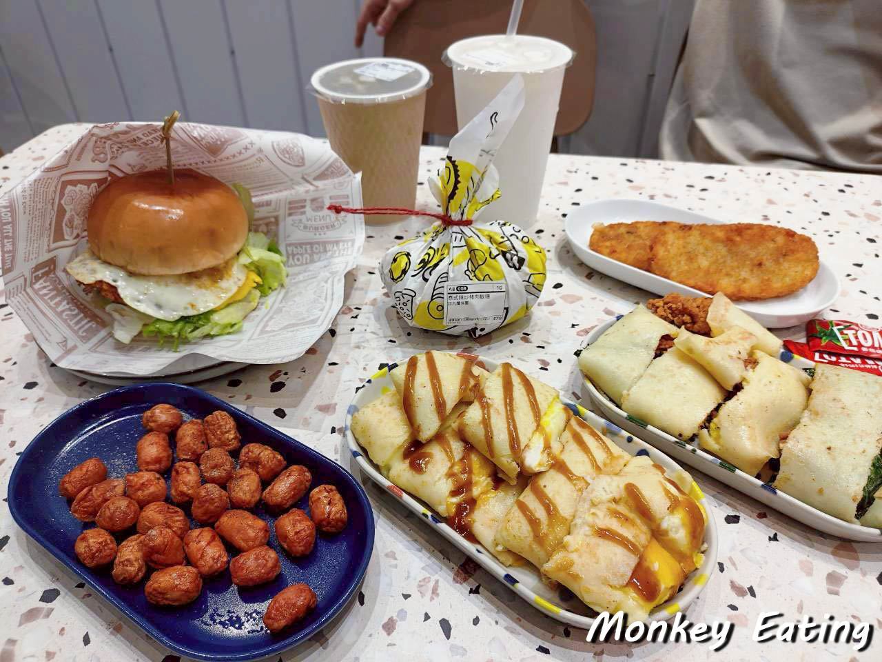 他們家的招牌飯糰系列是必點,除了泰式辣炒豬肉,還有其他口味可以選擇。蛋餅更是創意滿滿,除了傳統口味,還有很多外面吃不到的獨特組合,像是「雙重起司薯泥蛋餅」和「鹹酥雞蛋餅」就是我的最愛!漢堡系列也是紮實飽足,麵包鬆軟,肉排多汁。飲品的部分,豆漿、紅茶、咖啡也都有,而且都很好喝。