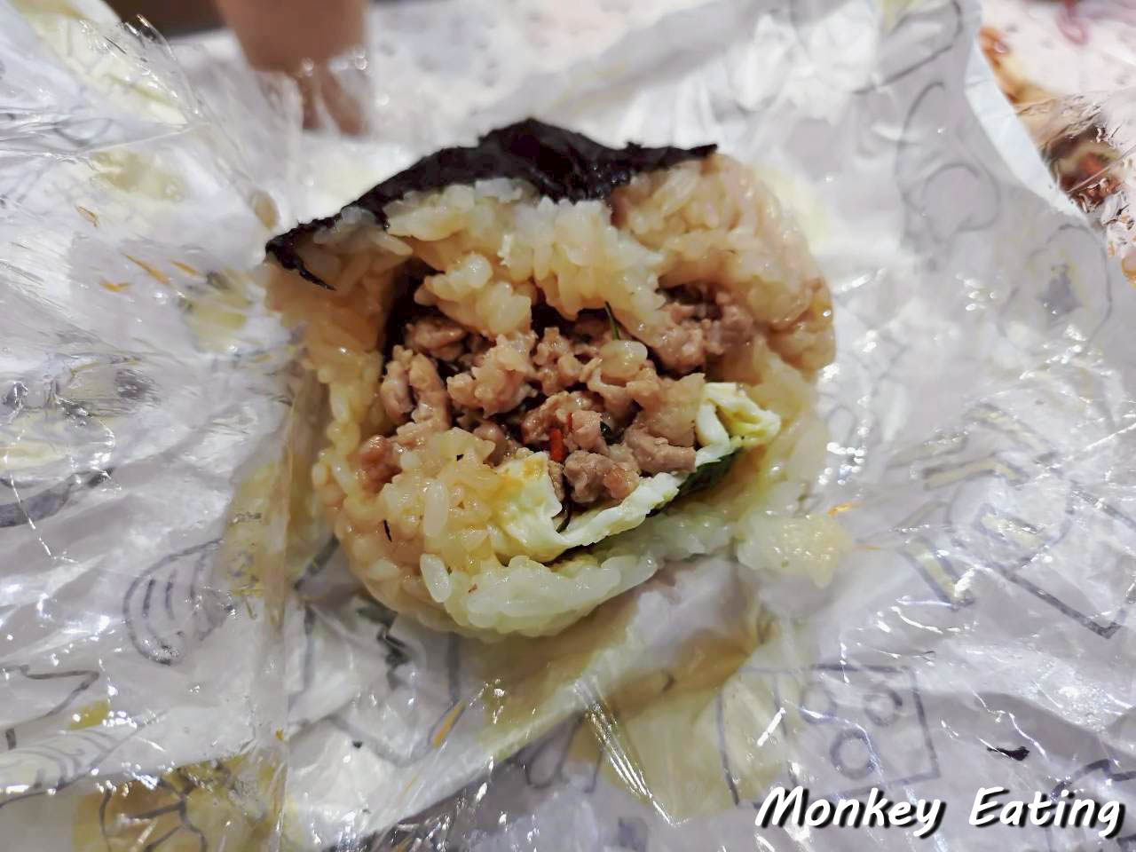 一口咬下,粒粒分明的米飯帶著彈性,內餡的泰式辣炒豬肉更是精彩!豬肉炒得非常入味,香辣中帶著點微甜,還有九層塔的香氣點綴,層次感超豐富。辣度是那種會讓你額頭微微冒汗,但又忍不住一口接一口的涮嘴辣度,真的太銷魂了,完全是泰式控的福音啊!