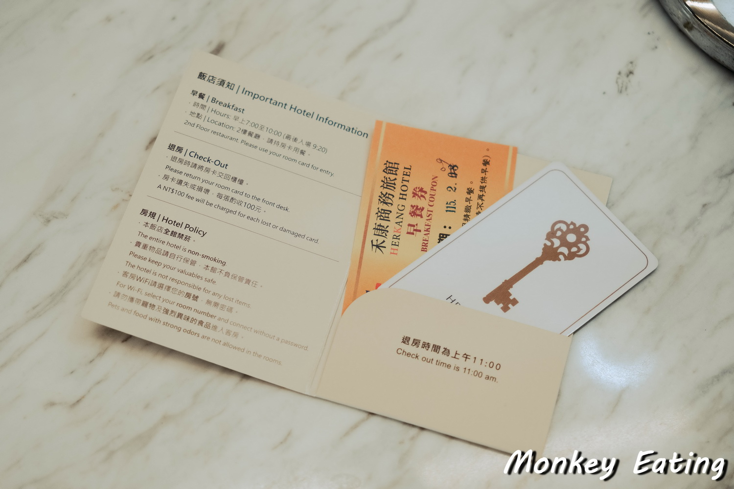 整體裝潢走的是一種低調奢華的質感,既有現代的簡潔,又帶有一點懷舊的優雅。接待櫃檯的服務人員親切又有效率,很快就幫我們辦理好入住手續,並遞上房卡跟早餐券,整個過程都很順暢。