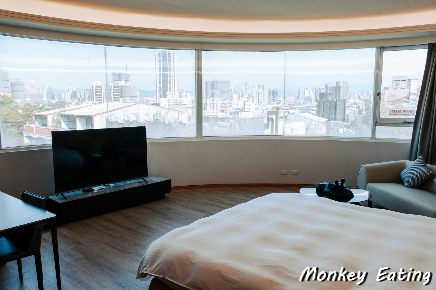 最棒的就是那扇環形景觀窗了,一覺醒來拉開窗簾,就能把外面車水馬龍的都市景色盡收眼底,好療癒啊!