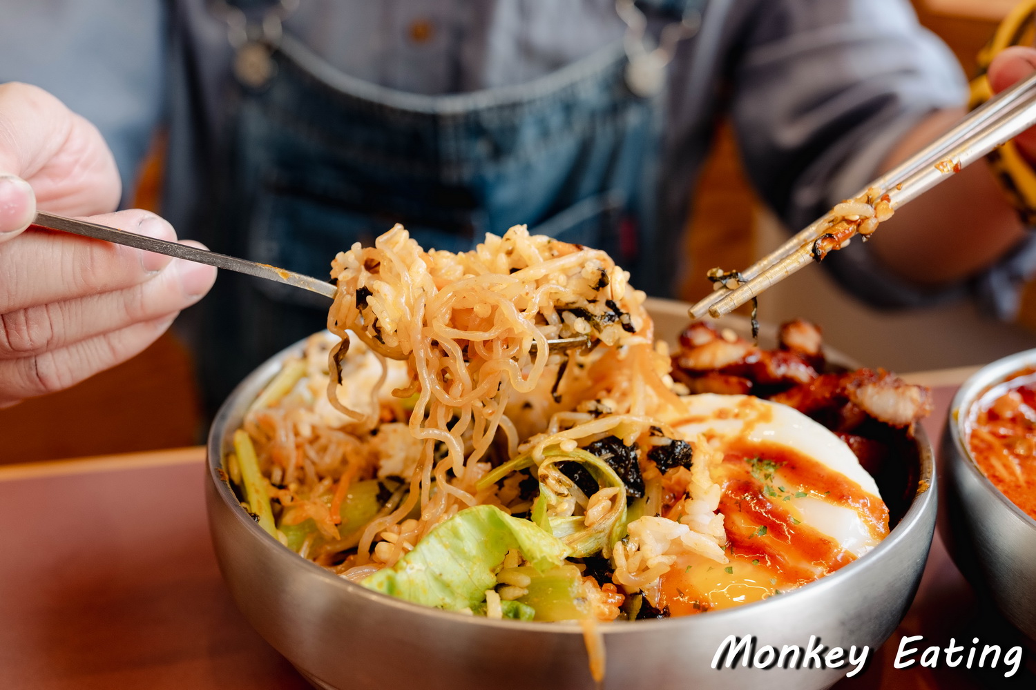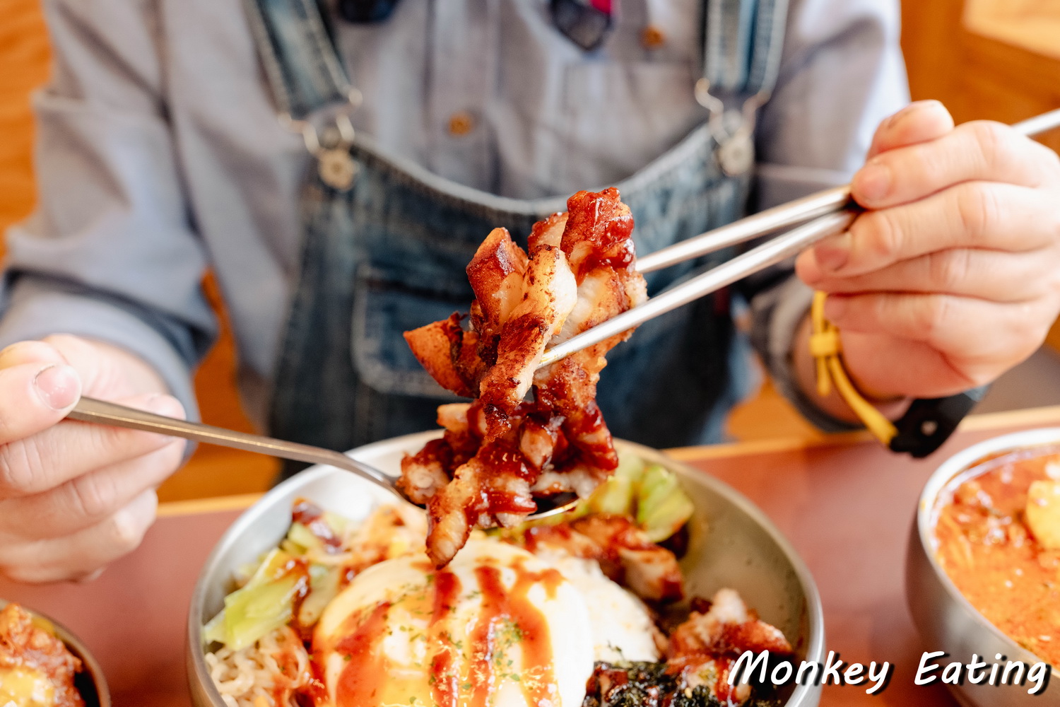厚切豬五花油脂香而不膩,搭配的是白米飯,配菜有海苔、豆芽、蔬菜等,還附了一顆荷包蛋,拌勻後香氣四溢,每一口都很有層次與飽足感,這一碗誠意十足。