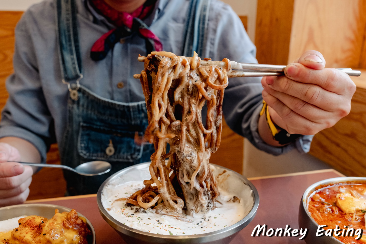 一上桌還以為是什麼甜點,滿滿的鮮奶油感覺就很邪惡。將經典韓式炸醬麵加入奶油元素,是我頭一次吃到的口味,醬香濃郁卻不死鹹,奶油讓整體更滑順,麵條Q彈,是一道創新又耐吃的麵食。