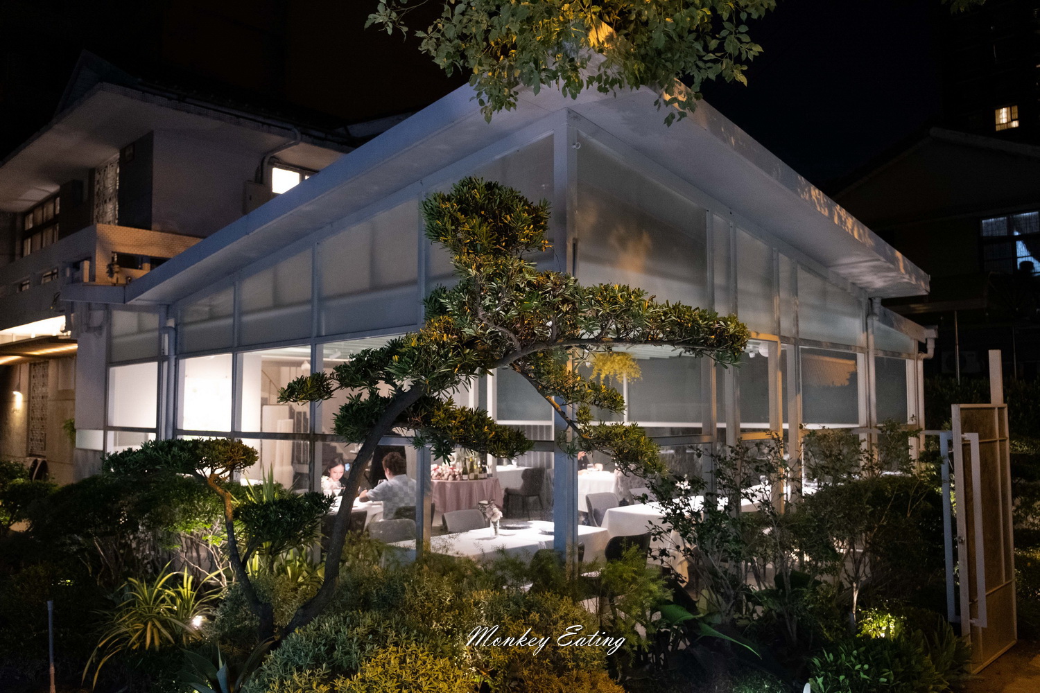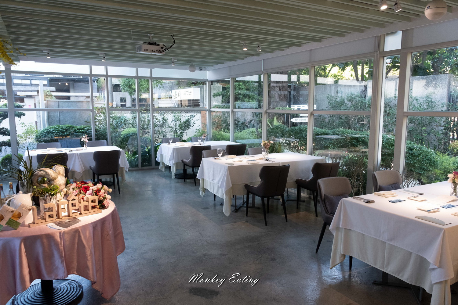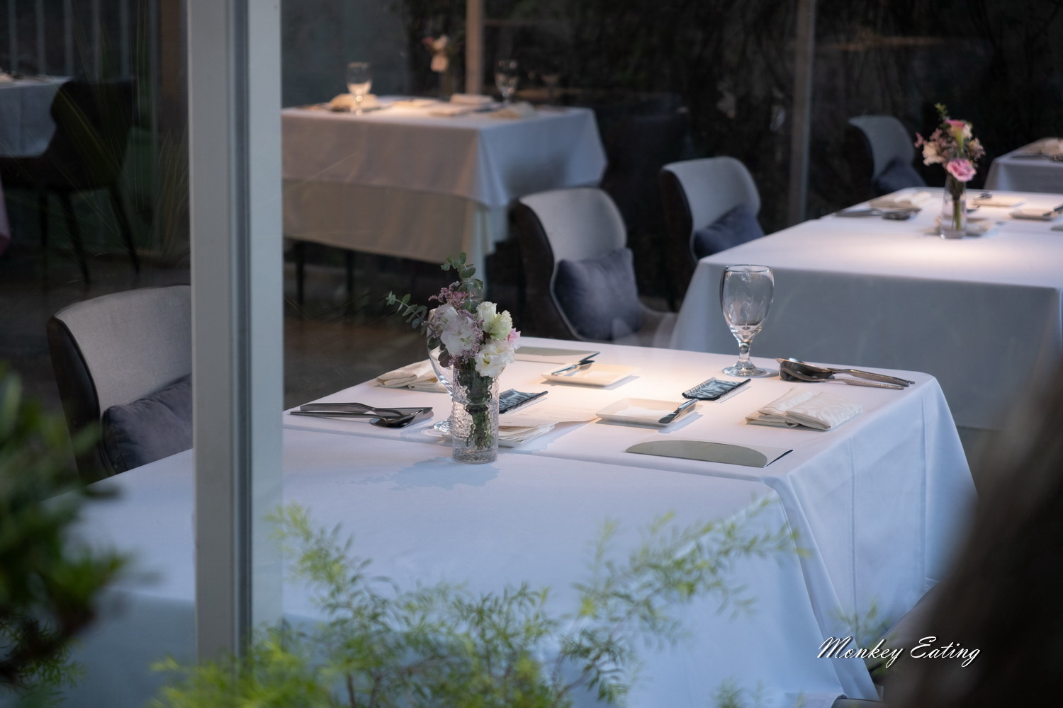 餐廳以純白玻璃屋設計為主體,搭配綠意盎然的小庭院,營造出如同置身藝術花園的氛圍。