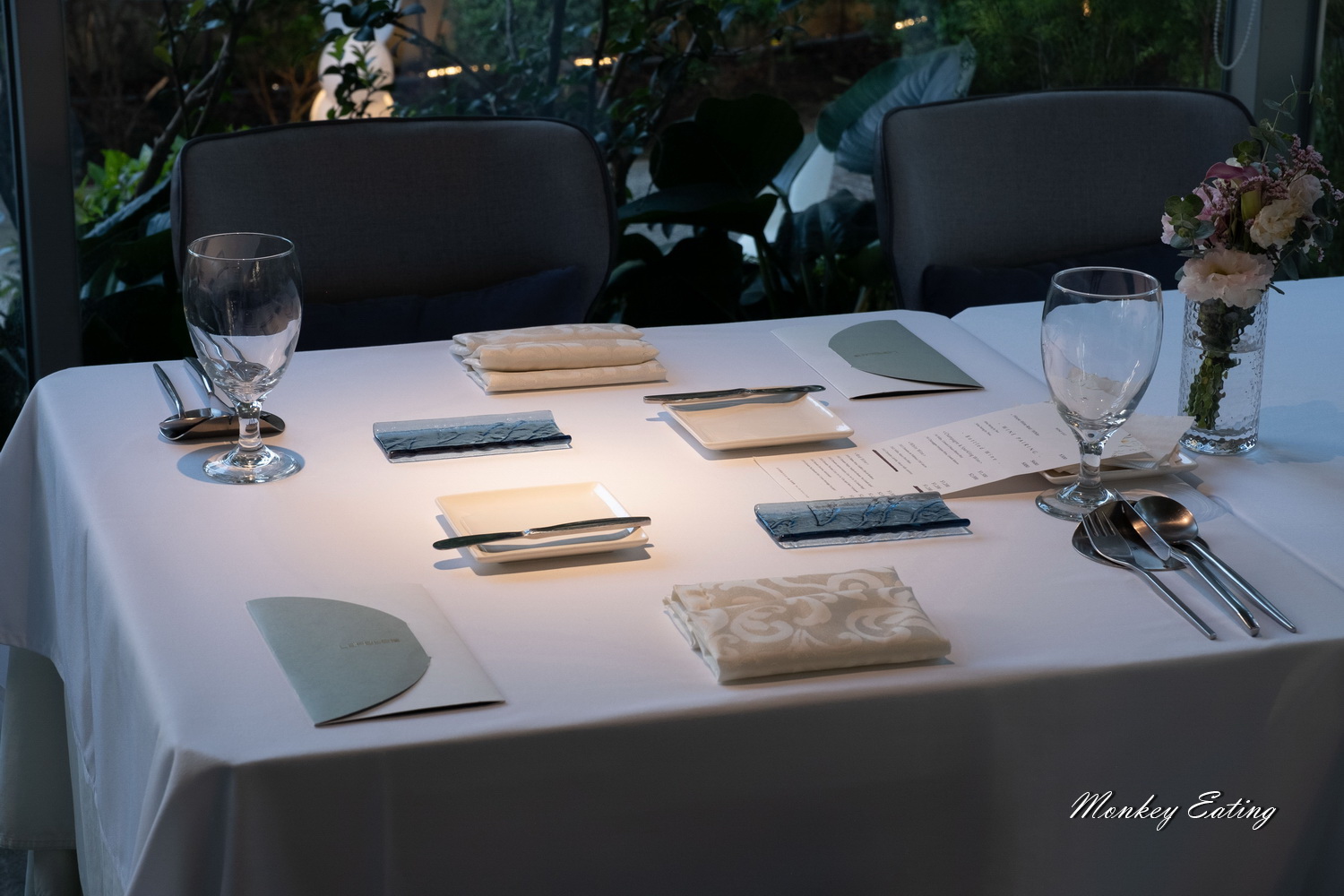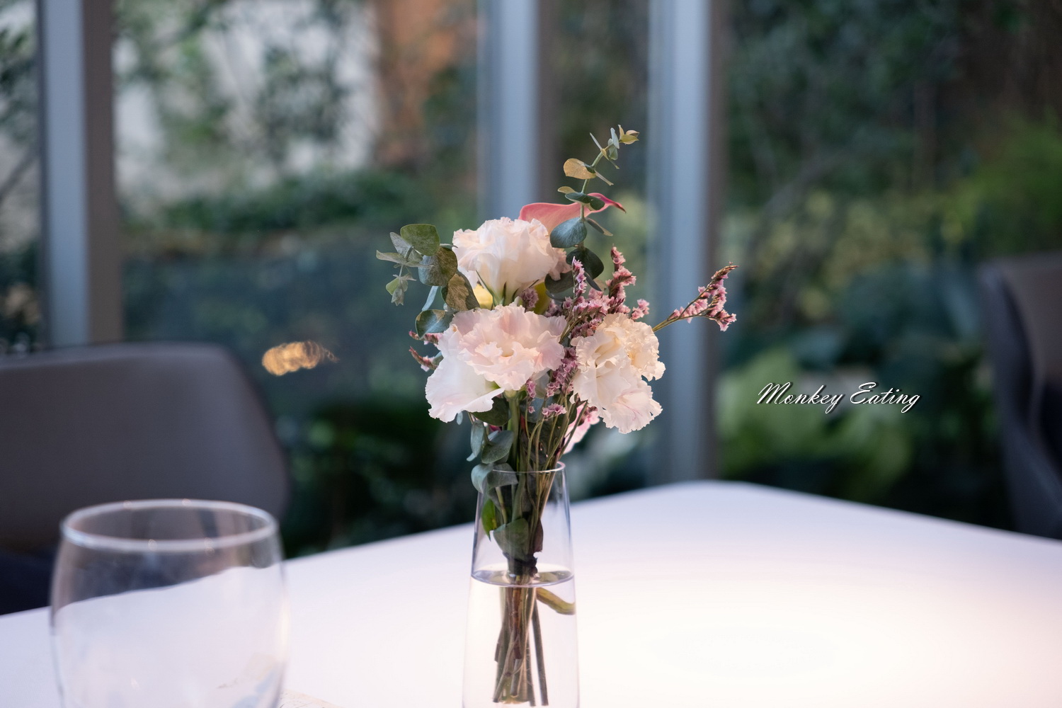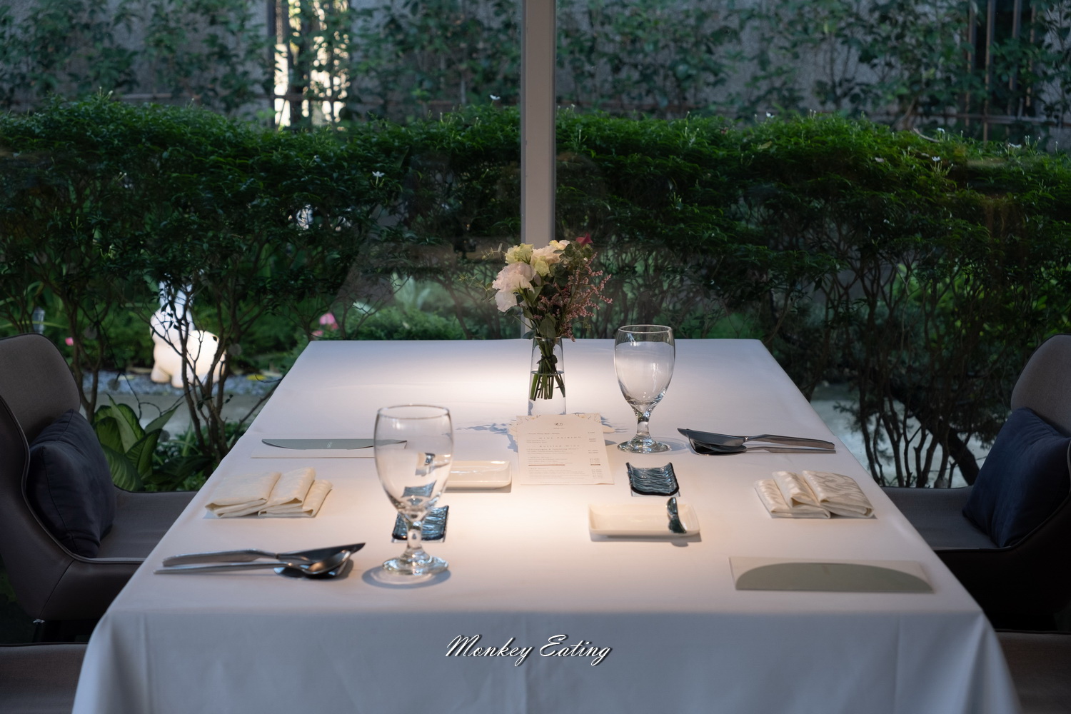 餐廳以純白玻璃屋設計為主體,搭配綠意盎然的小庭院,營造出如同置身藝術花園的氛圍。
