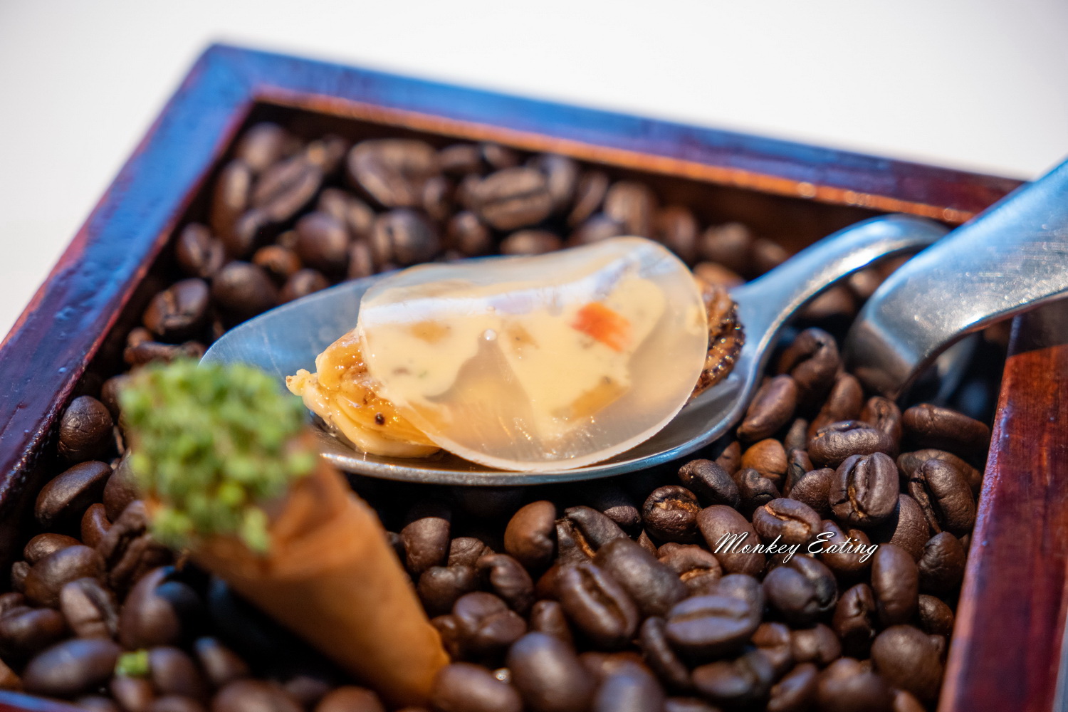 另一個油封淡菜,上面搭配的是蔬菜湯凍,調味適中,口感清爽,特別是淡菜還保留原有的彈性,口感很棒。