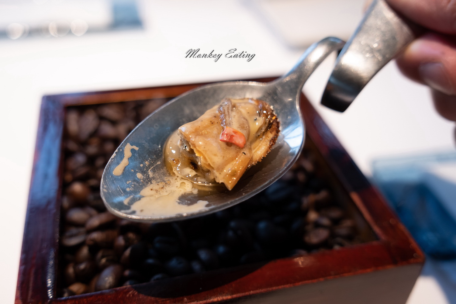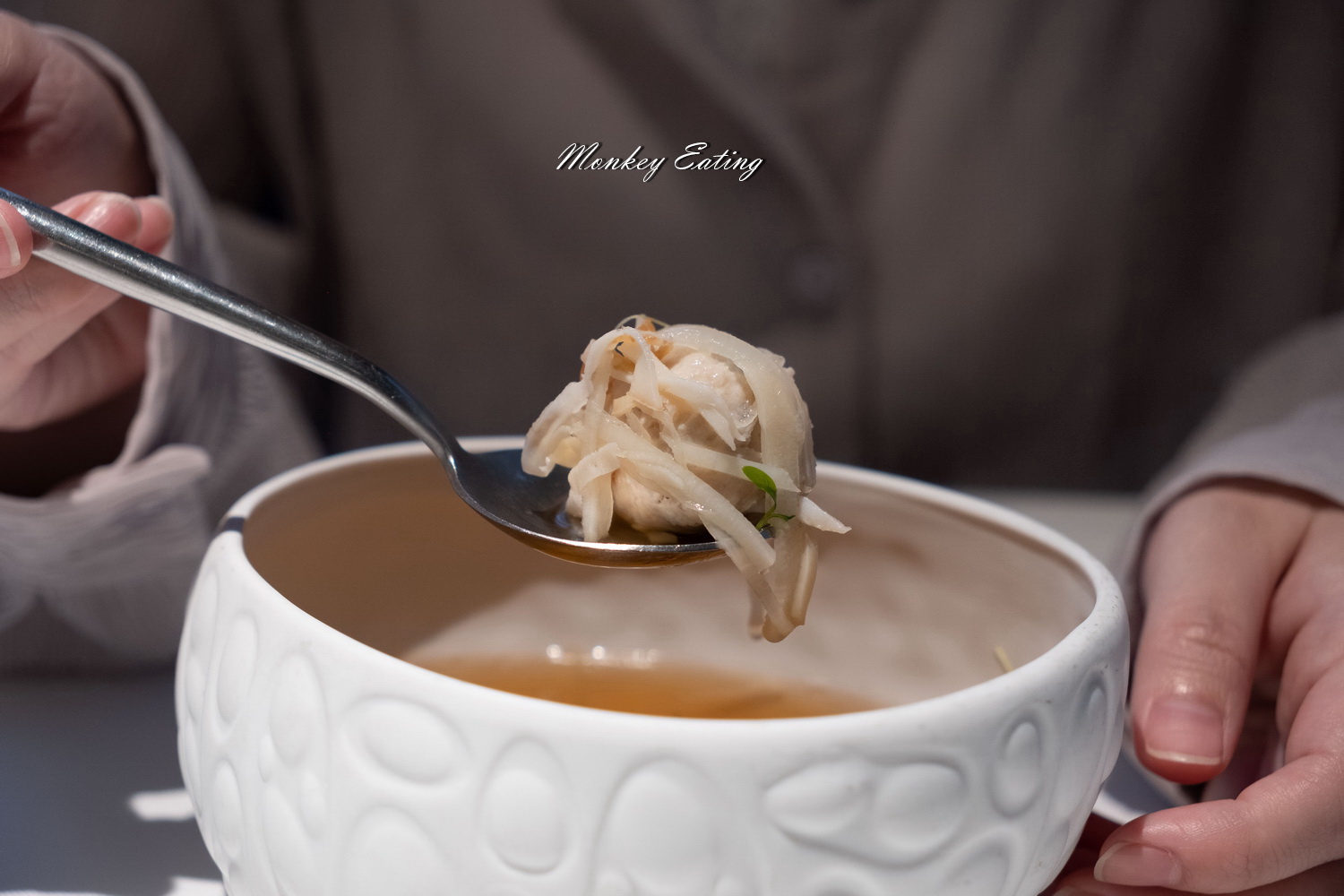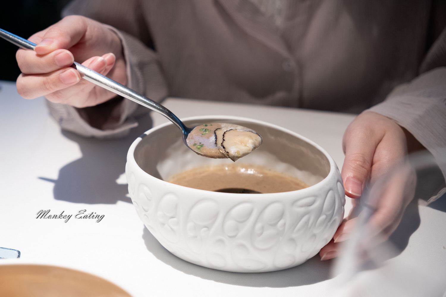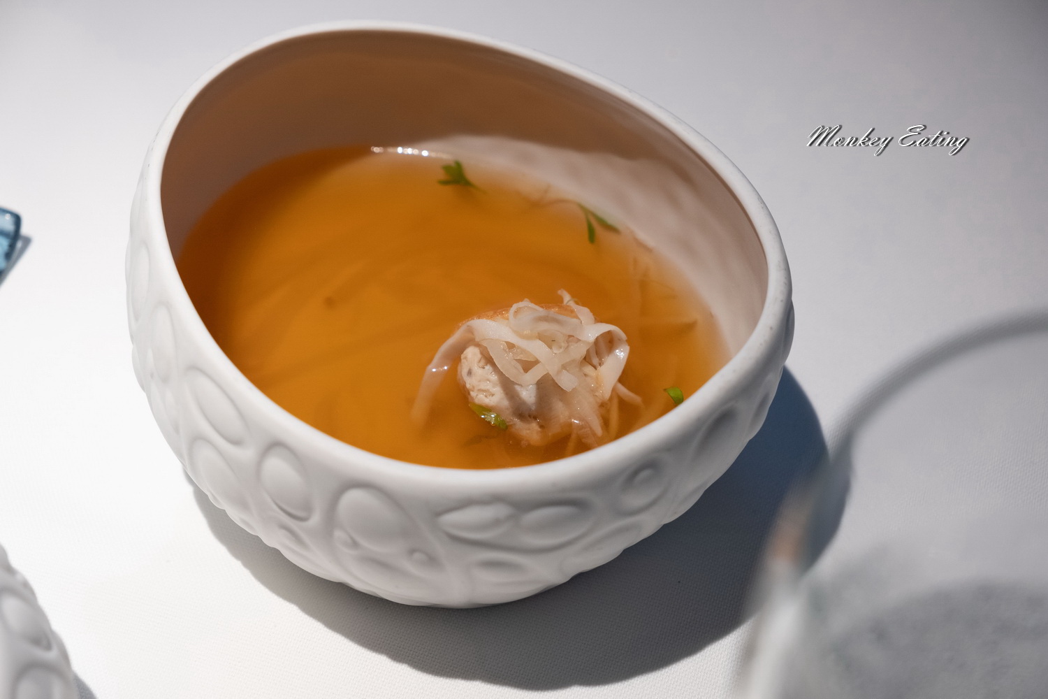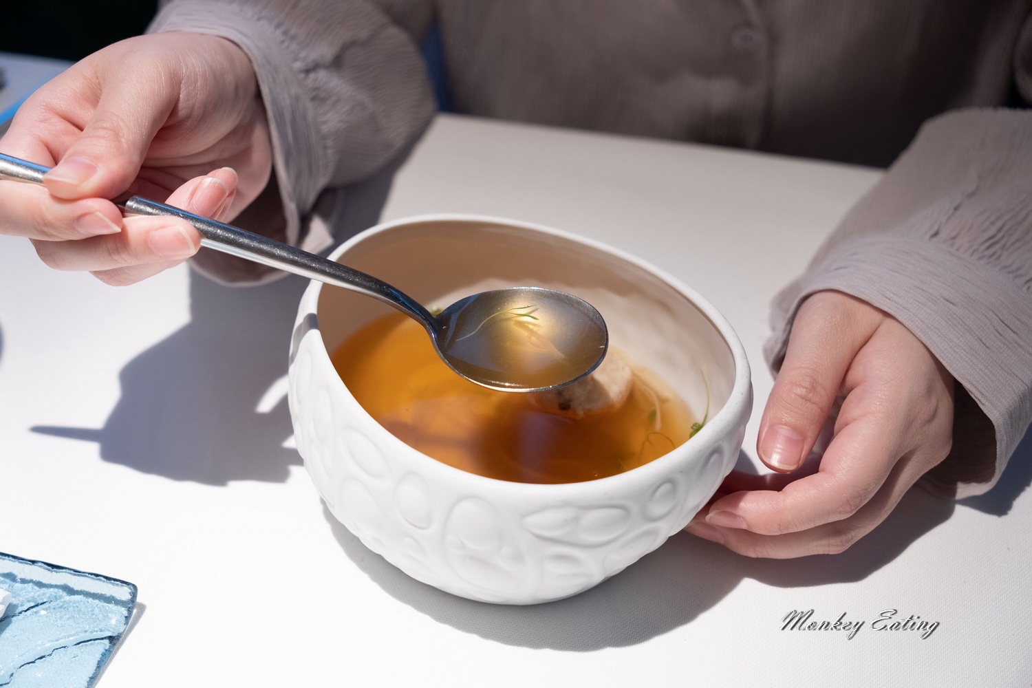 黃金綠竹筍鮑魚雞清湯,湯頭乍看之下相當清澈,喝起來香甜順口。再嘗一口雞肉慕絲球感受到融合了雞湯的濃郁、鮑魚的鮮甜、與綠竹筍的爽脆甘甜,每一口都是極致的平衡。