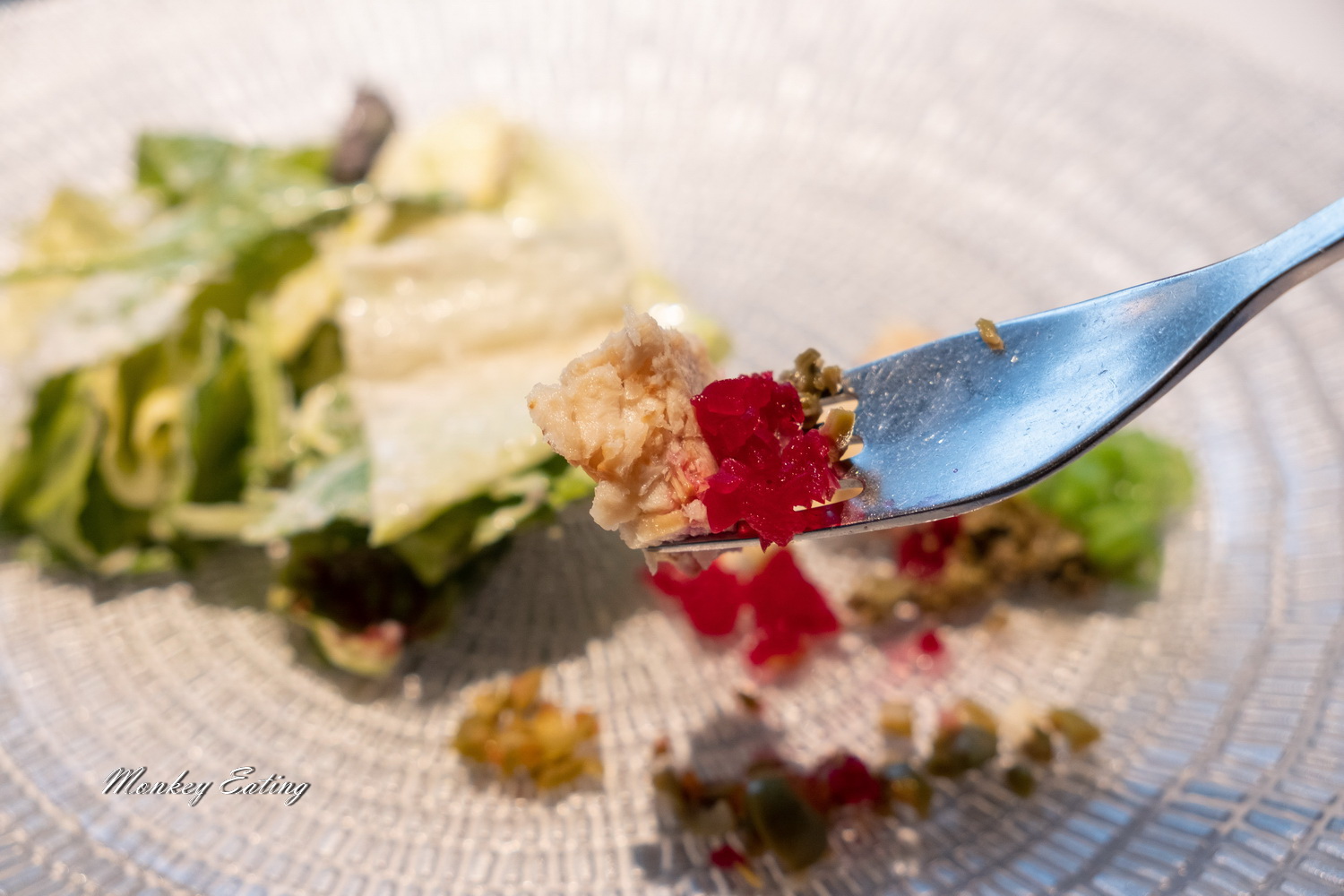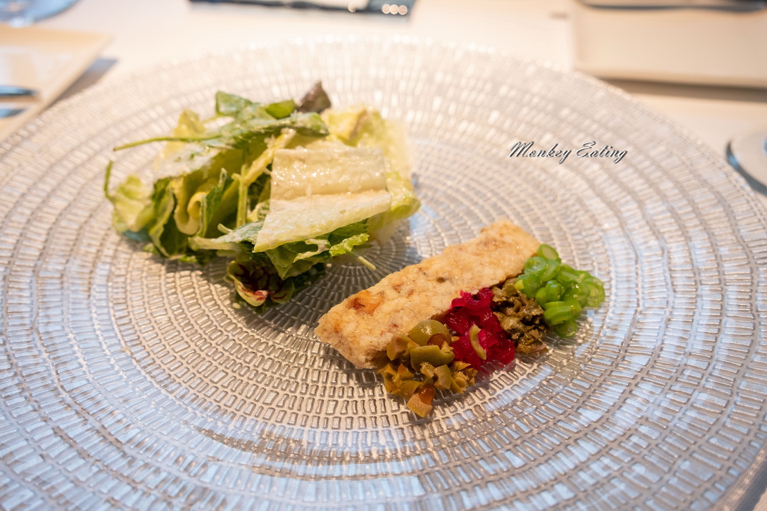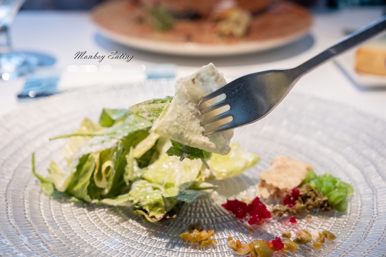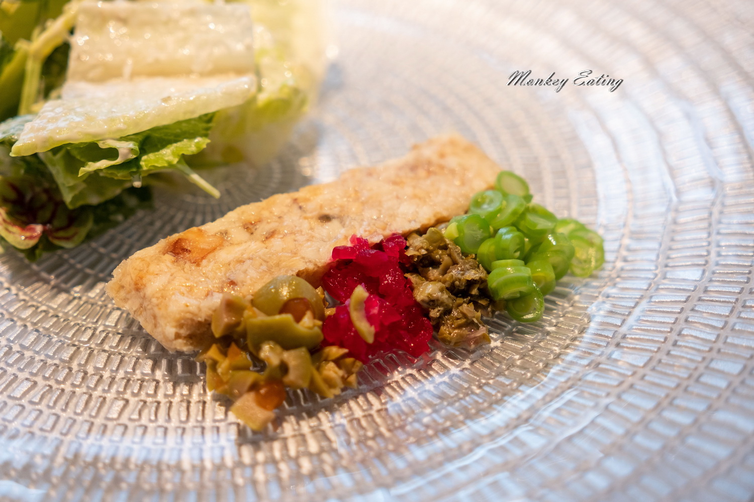 南法煙燻野生魚沙拉,主廚特製的煙燻鮪魚魚凍搭配凱薩沙拉,魚肉凍很新鮮,可以配著旁邊的佐料一起吃,品嘗不同風味。很喜歡凱薩醬的調味,讓生菜沙拉變的不再單調,這道沙拉讓人意猶未盡。