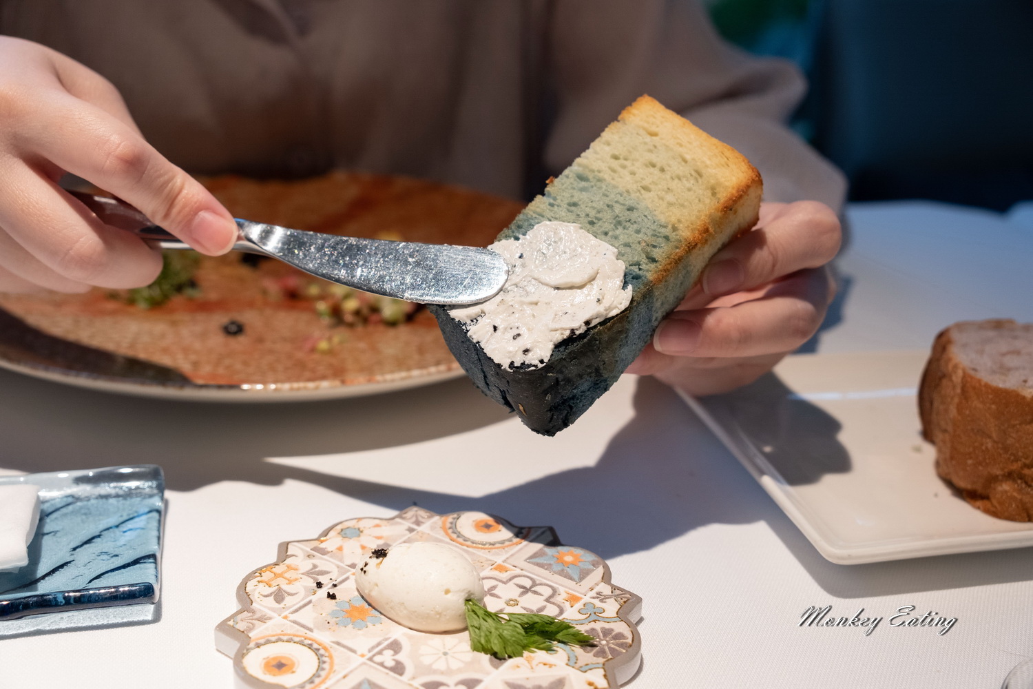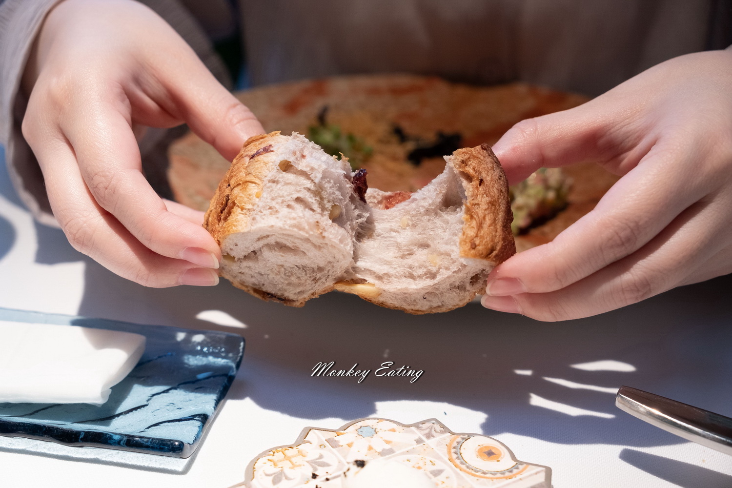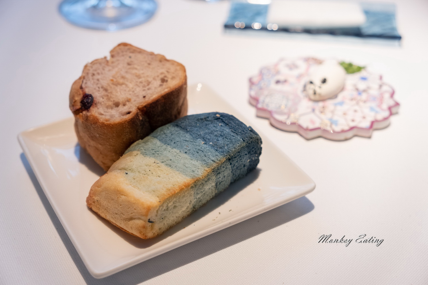 烤好出爐熱騰騰的麵包,在一上桌便被它的香味給吸引。藍染麵包用的是天然植物元素,做成藍色漸層的效果,口感非常軟綿好吃。另一個則是桑葚核桃麵包,有堅果的香氣,外酥內軟,抹上自製的鯷魚奶油醬,吃起來別有一番風味。