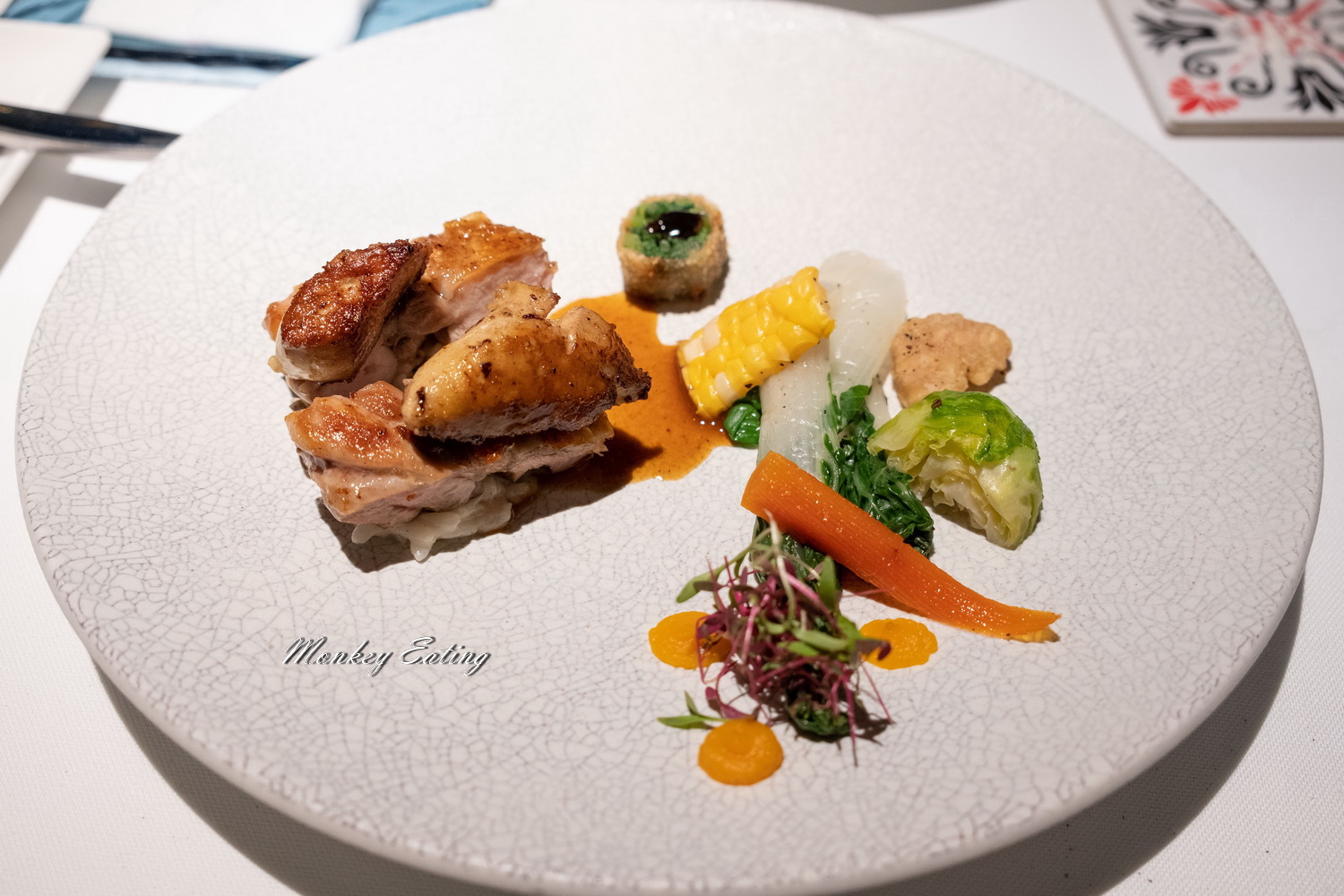 薩索雞搭小農蔬菜,看似樸實,卻最能吃出食材原味。其中以豆皮包裹龍鬚菜下去油炸,充滿創意也有層次。薩索雞肉質結實、有嚼勁,風味濃郁,外層微煎至金黃,酥香脆皮下,是最純粹的雞肉原味。