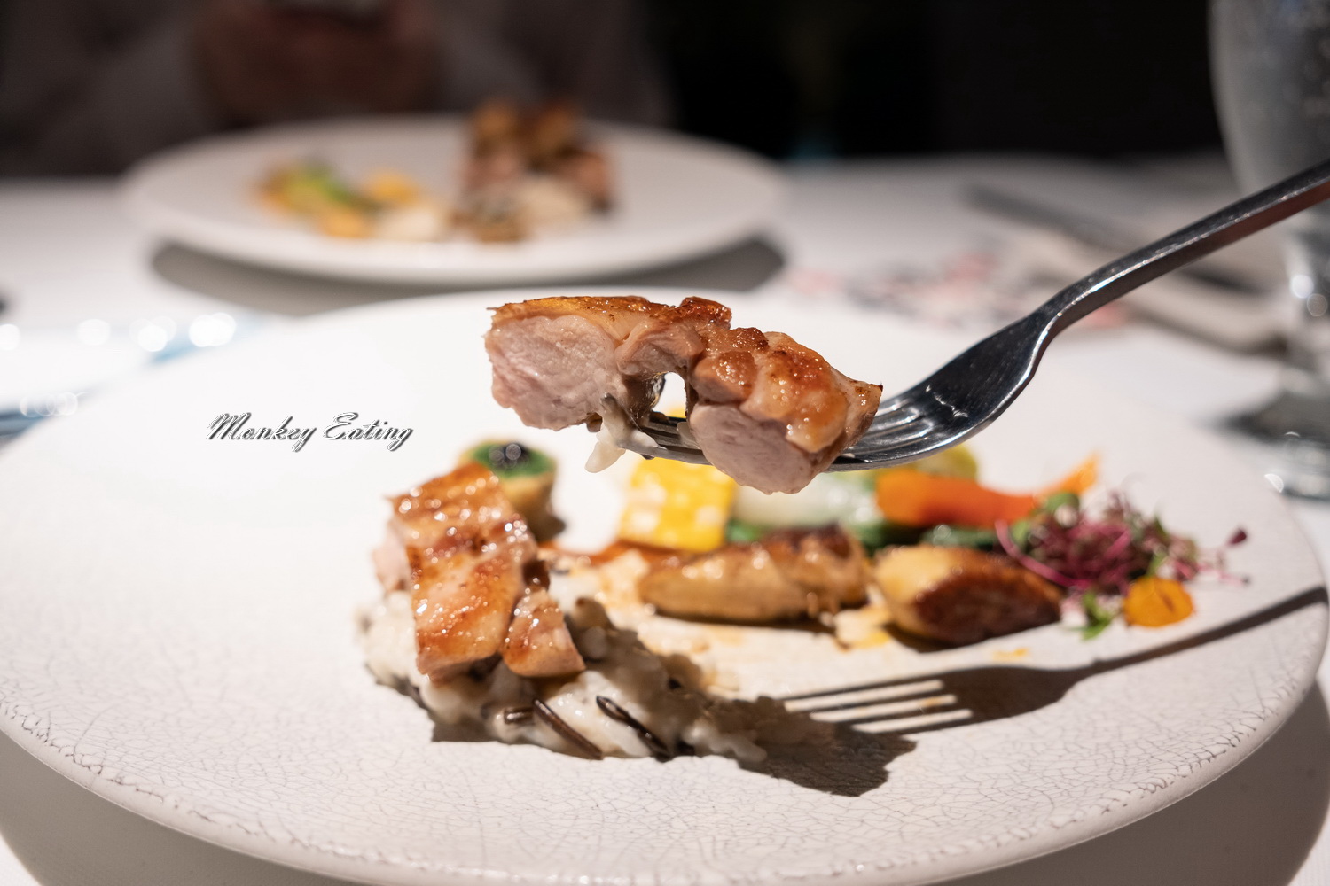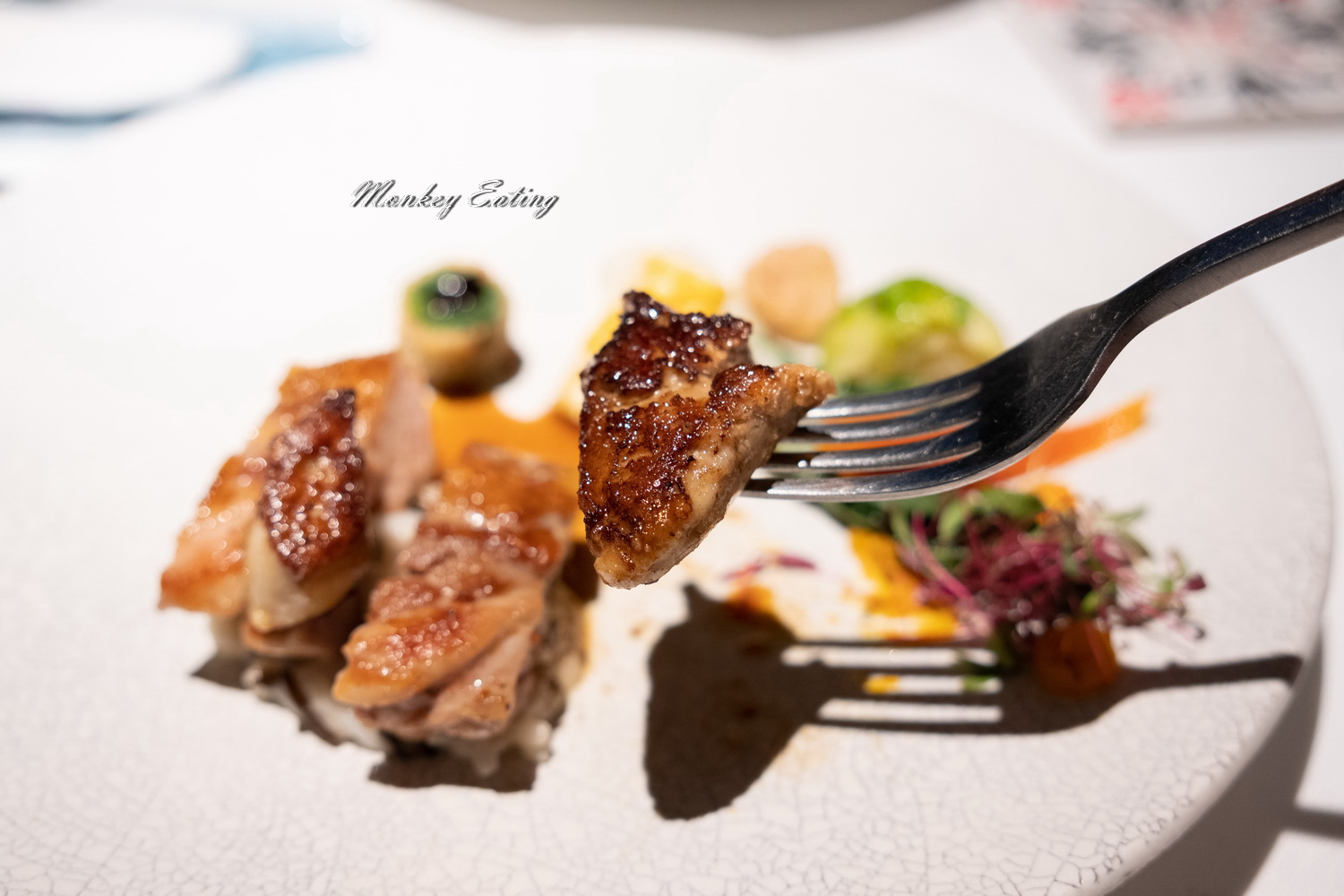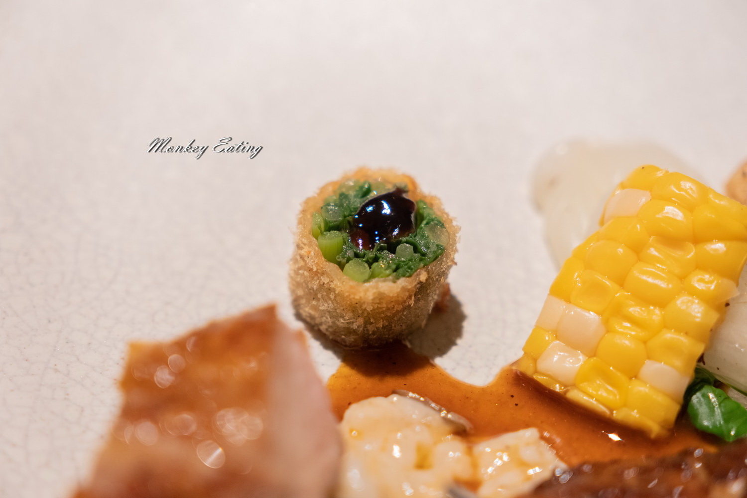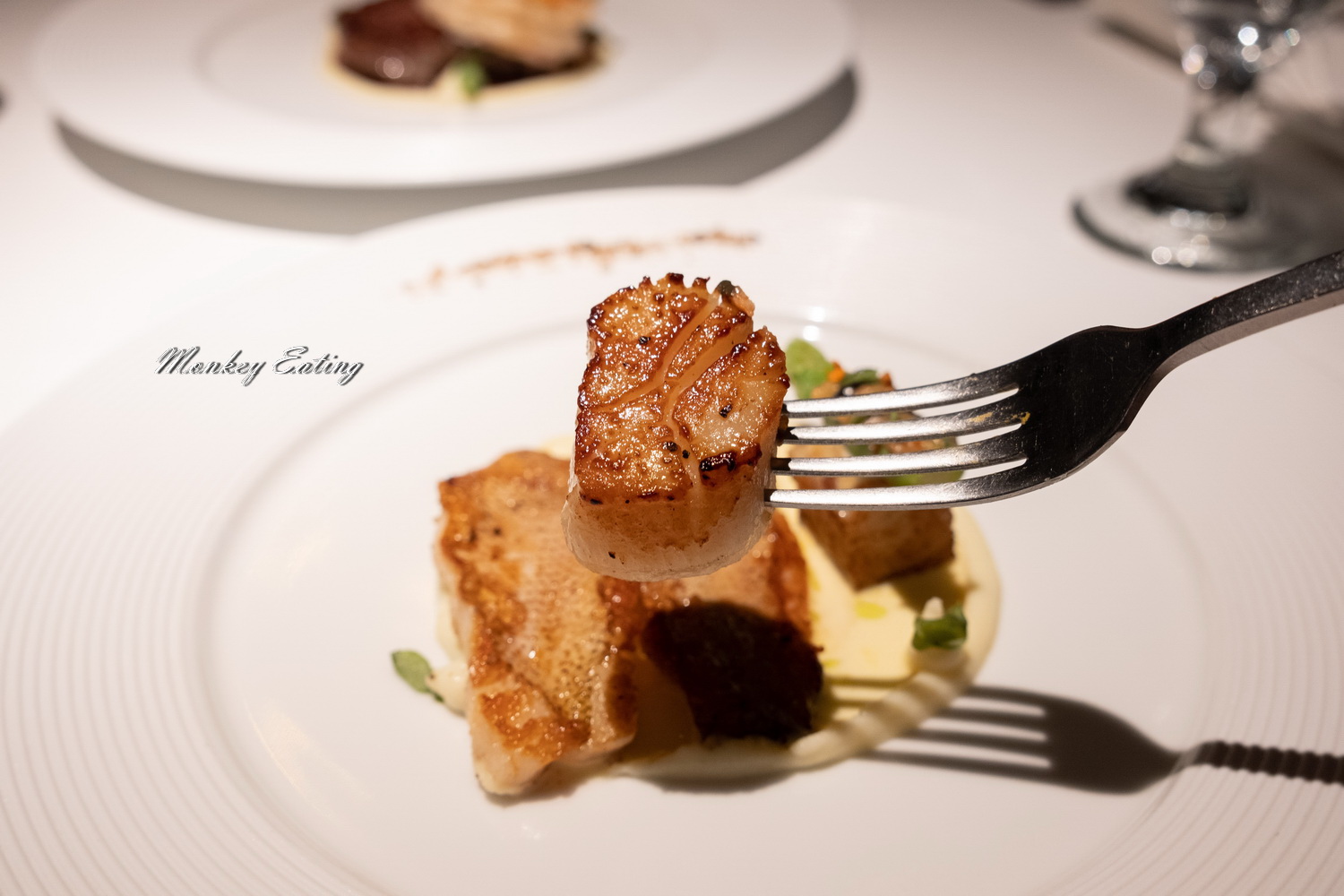 主廚將紅喉香煎至金黃焦脆魚皮,內裡則保持水嫩細滑,柔軟細嫩的肉質口感。紅喉+北海道干貝,一脆一嫩,一香一甜,再配一口白酒,完美!