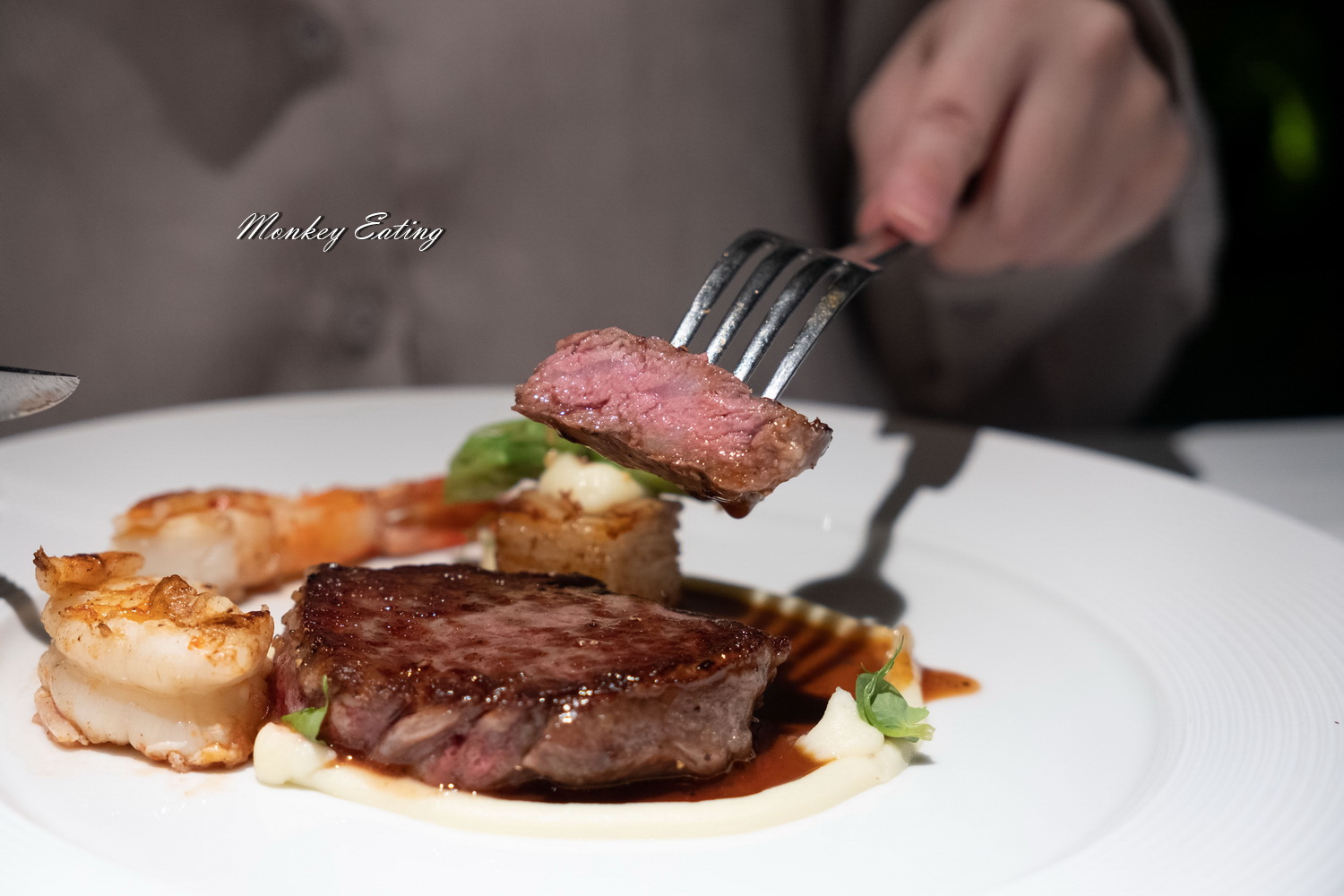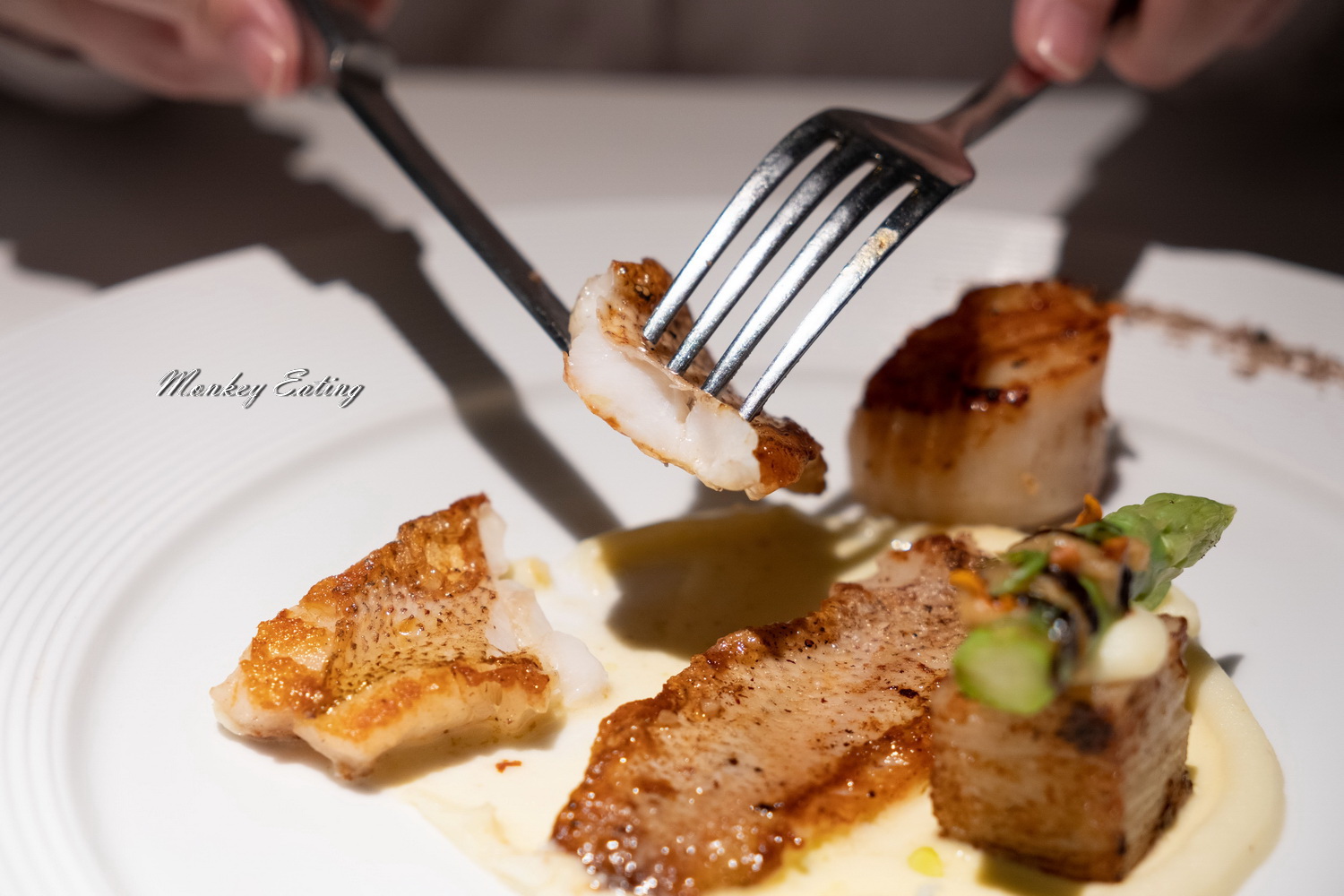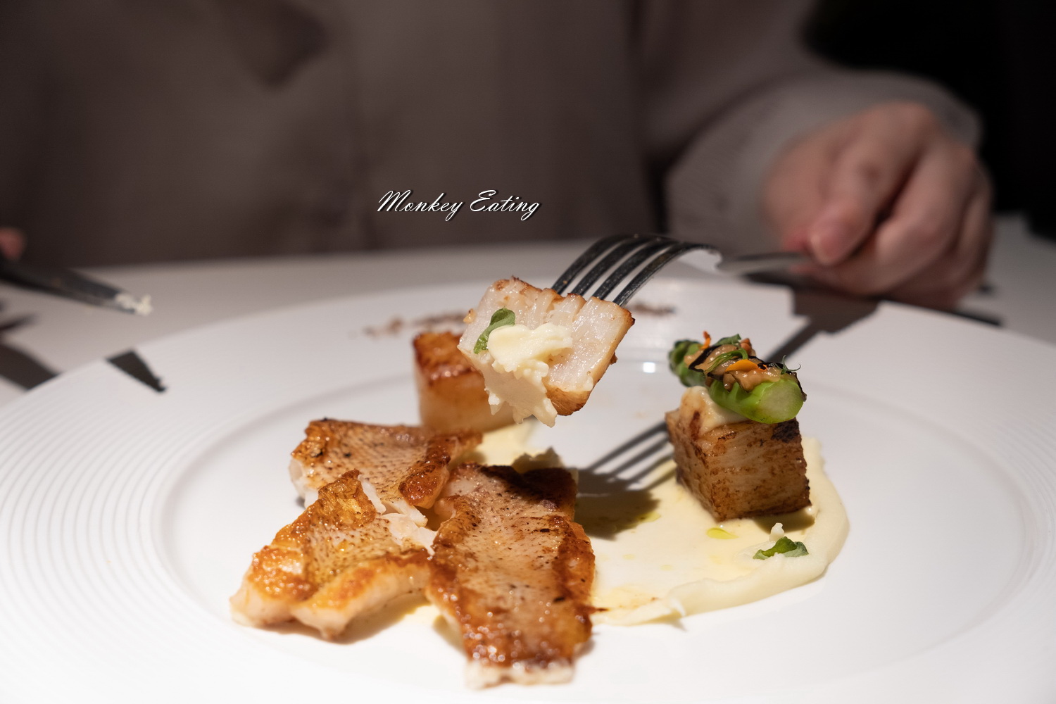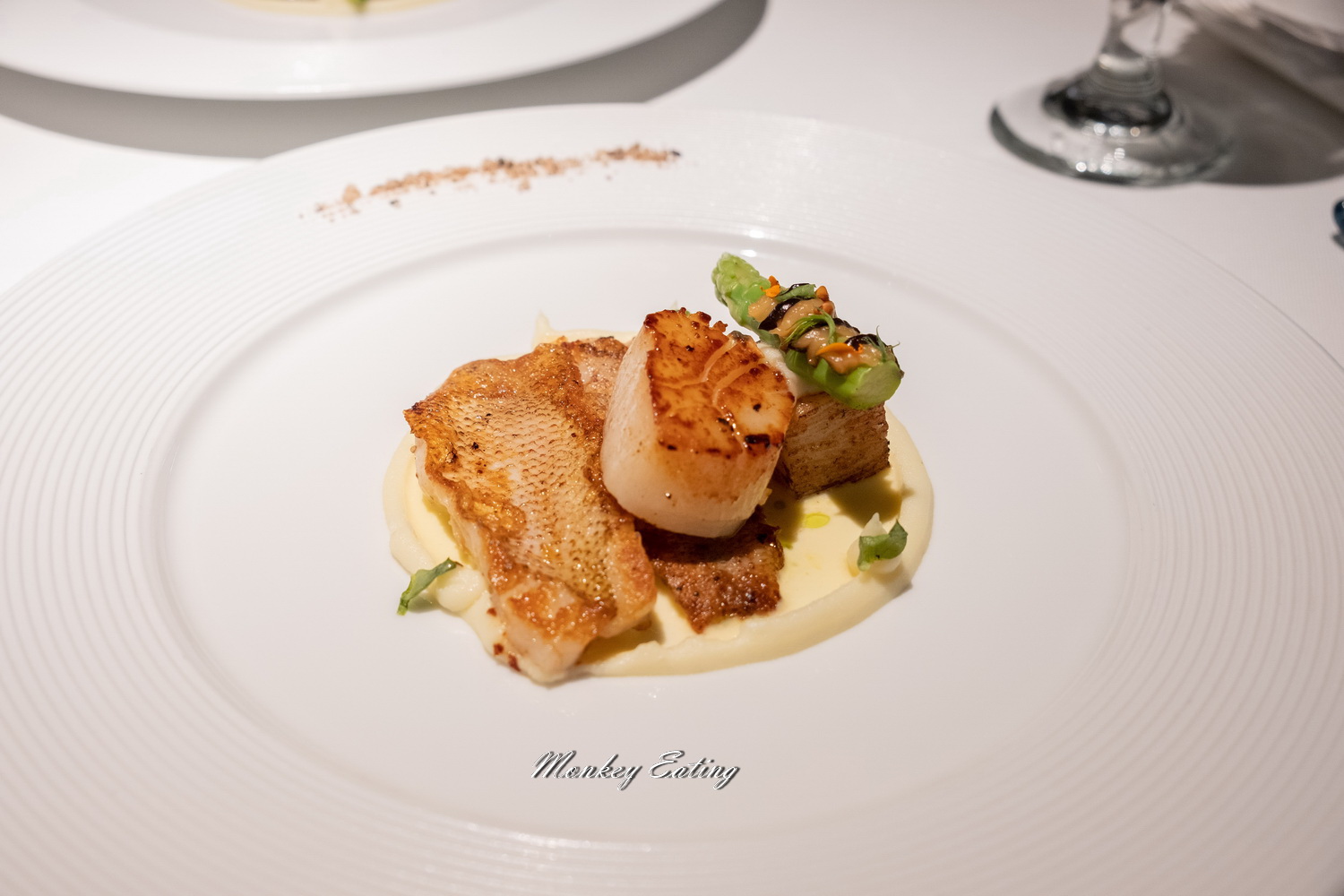 主廚精選深海紅喉魚搭配北海道生食級干貝,以法式技法詮釋食材。北海道干貝煎至表面微焦、內部仍保有生食般的柔嫩與汁水,每咬一口都是甘甜海味在口中爆發。