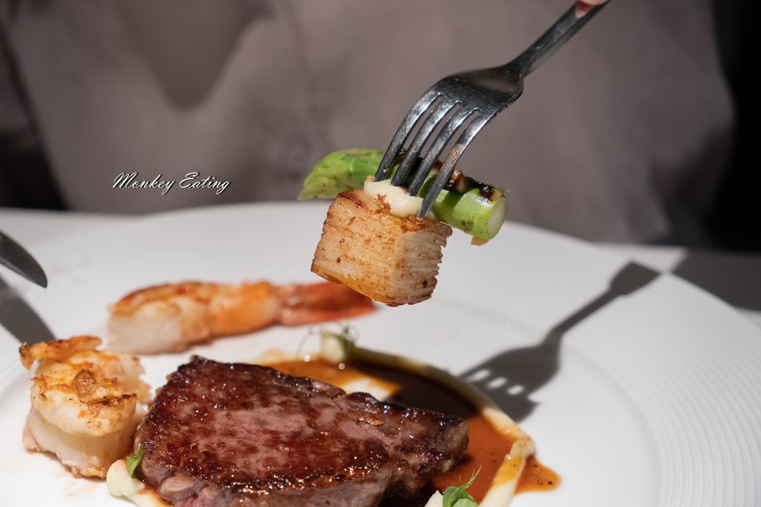 千層馬鈴薯造型在口感上也特別有層次感,搭配新鮮蘆筍,清爽脆甜的滋味在嘴中散開。