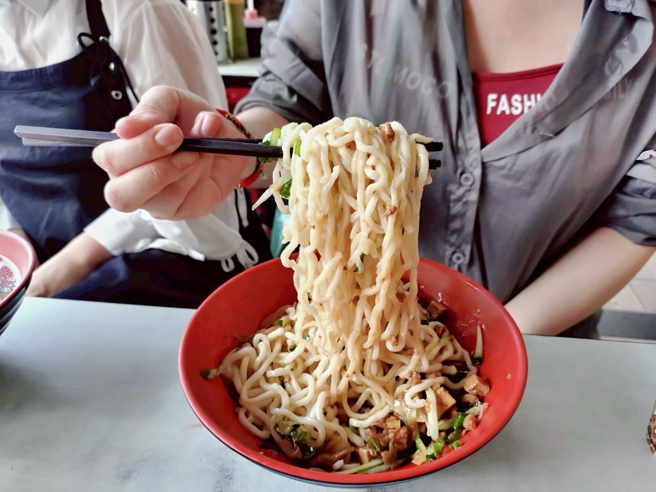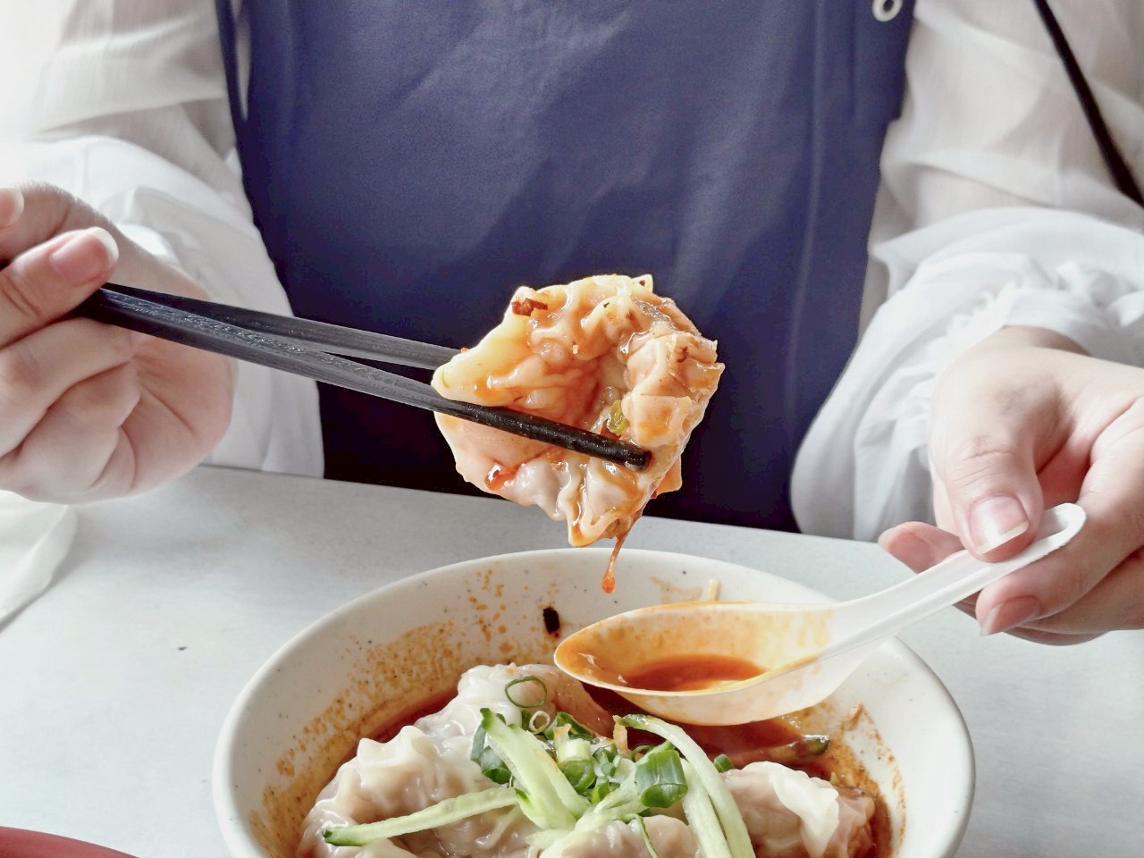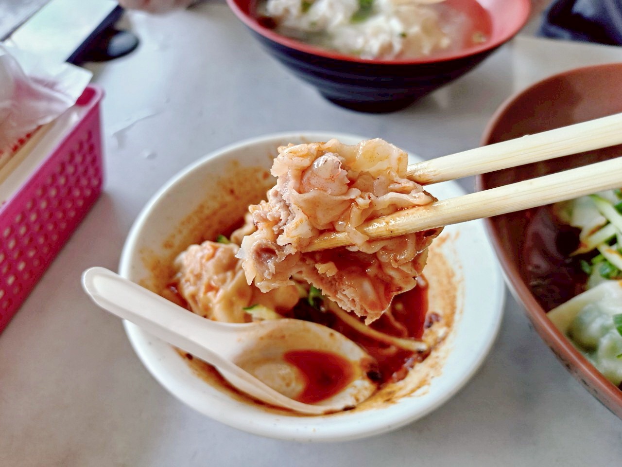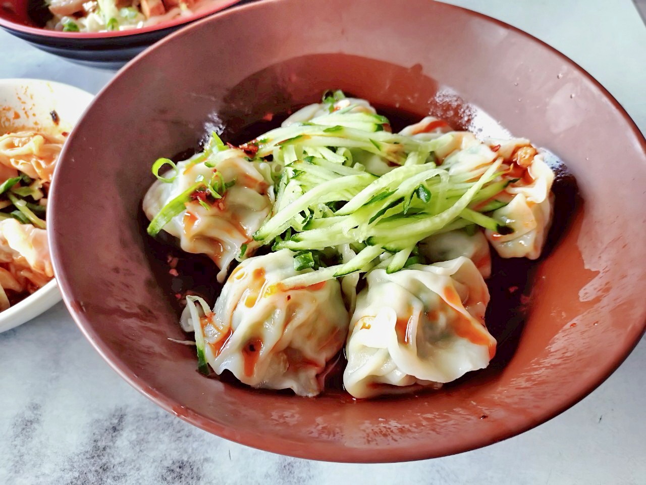 每一顆紅油抄手,都是手工包製,裡頭包的是整尾鮮蝦與少量豬肉餡做基底,吃起來不是那種混肉泥的蝦漿,而是咬得到真材實料的蝦仁脆度。一口咬下,先是麻辣紅油襲來,接著蝦仁的鮮味在口中爆開,層次感非常豐富。