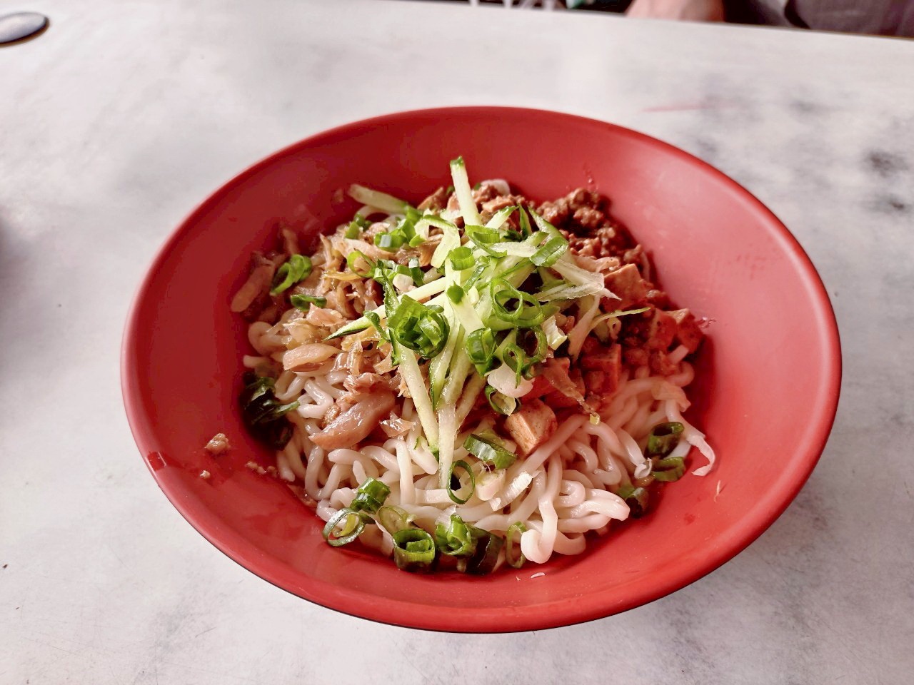 這碗炸醬麵乍看低調,卻是店內老顧客每週回訪的必點品項之一。麵條採用和牛肉麵相同的中粗手工麵,口感Q彈有勁,不易軟爛。重點在醬料是自炒黃豆醬與碎豬肉慢火燉煮,沒有過多油膩,吃起來鹹香帶甜,醬味濃郁卻不死鹹,和麵條完美融合。再搭配些許黃瓜絲、蔥花與少量辣油提香,不僅層次豐富,也讓整碗麵不會過於乾口。