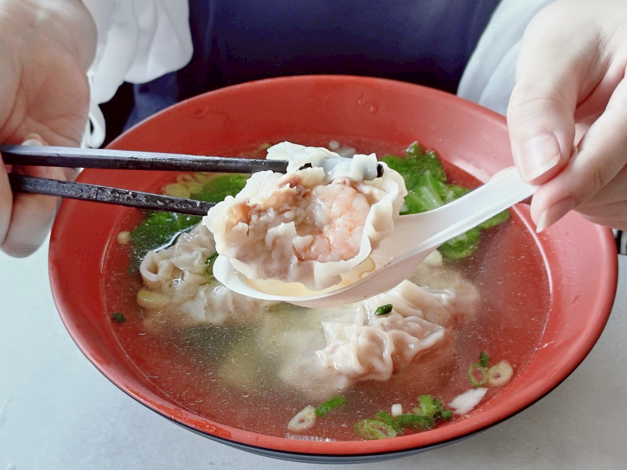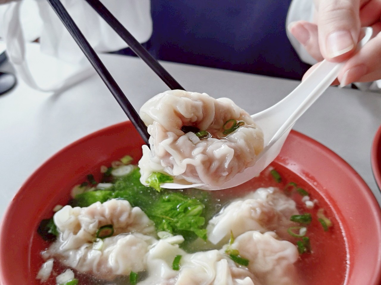 龍華閣的餛飩全是手工包製,選用整尾蝦仁搭配細緻豬肉末為內餡,肉與蝦的比例拿捏得恰到好處。每一顆餛飩個頭都不小,外皮薄透,口感滑嫩,湯匙一舀就是滿滿一口。湯頭喝起來清甜回甘又不油膩,適合全家大小、長輩或小孩都能安心享用。搭配些許青菜、蔥花與胡椒提味,整體風味乾淨有層次。