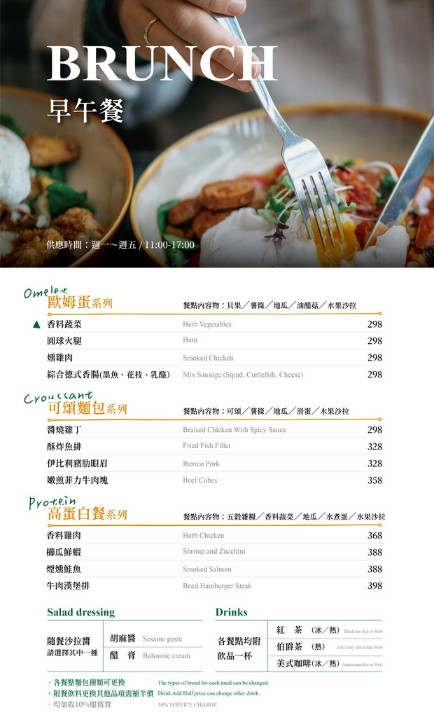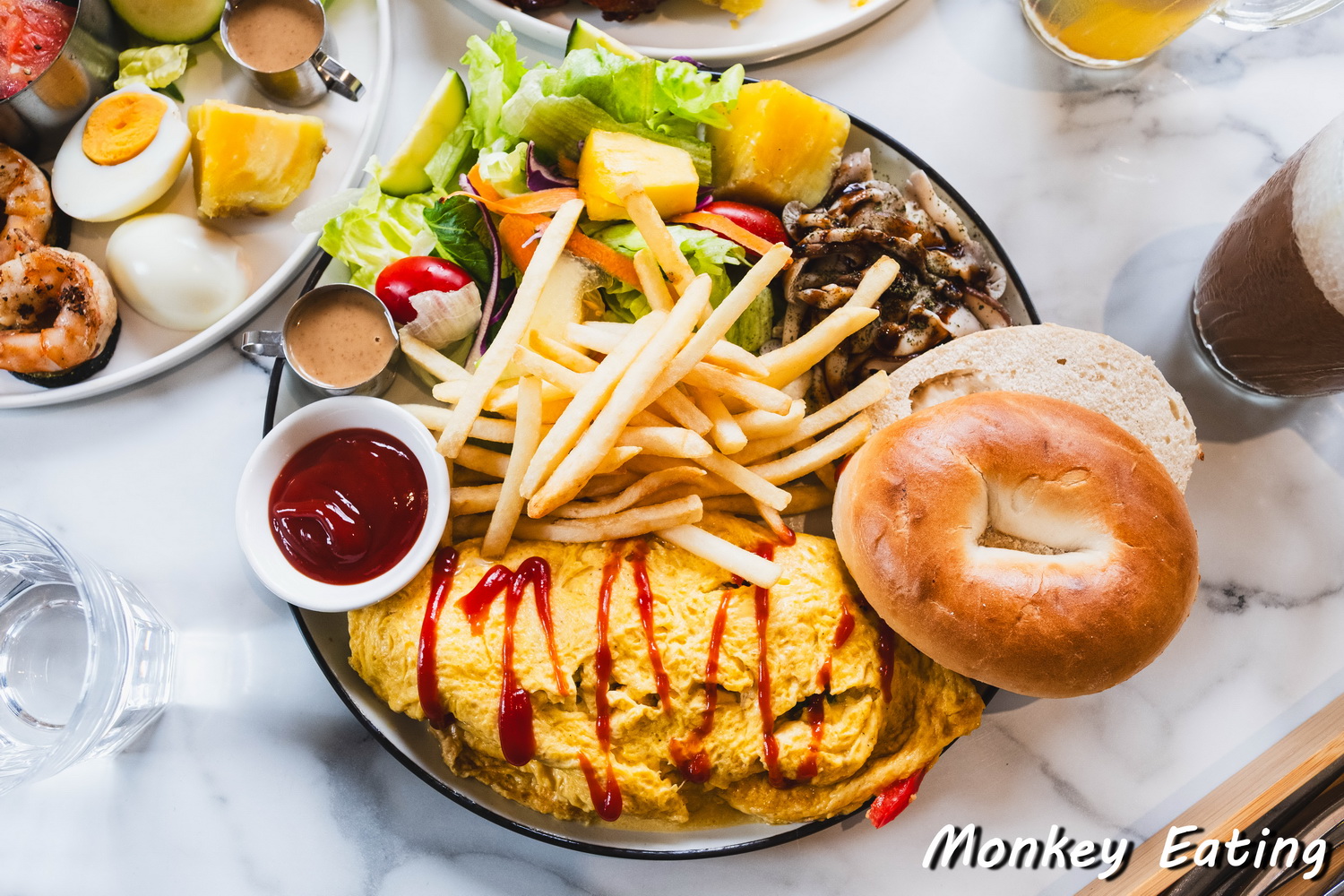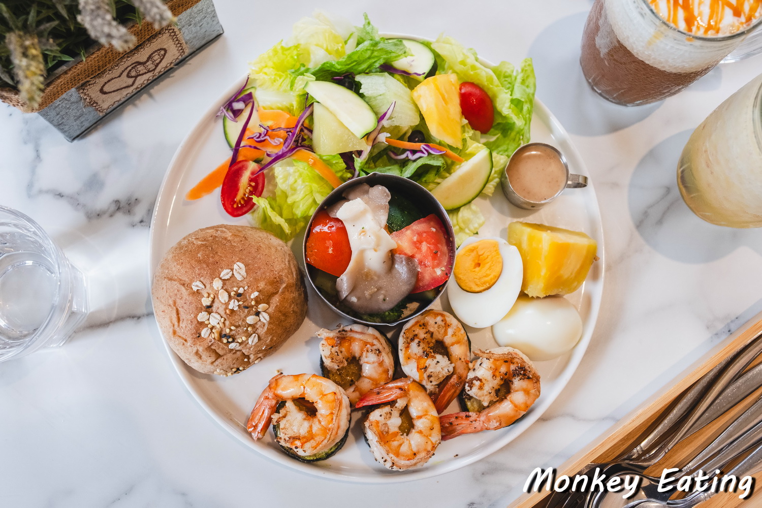 米蘭街除了主打義大利麵、燉飯、披薩之外,還有新推出平日限定早午餐系列,有歐姆蛋、可頌麵包、高蛋白餐可以選擇,套餐包含麵包、沙拉、蛋、地瓜以及看個人喜好搭配不同主食,菜色豐盛份量也很飽足。