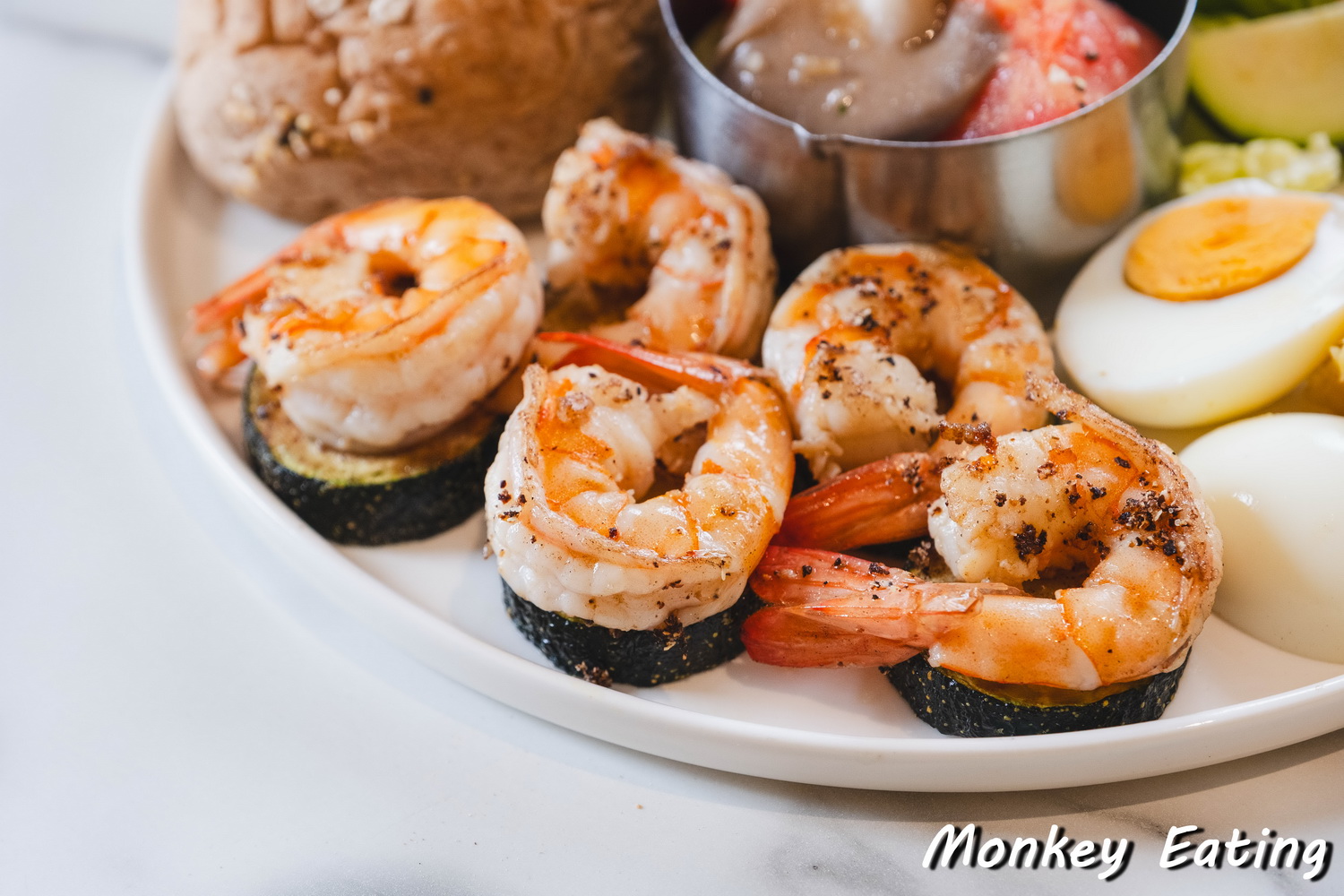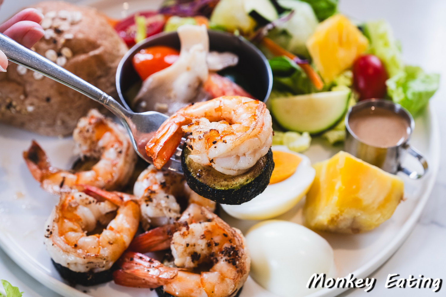 鮮蝦煎得剛剛好,保有彈牙口感,底下鋪的是煎得微焦的櫛瓜片,一口咬下去,蝦的鮮+櫛瓜的甜,完全沒違和感,吃起來很清爽沒有負擔。
