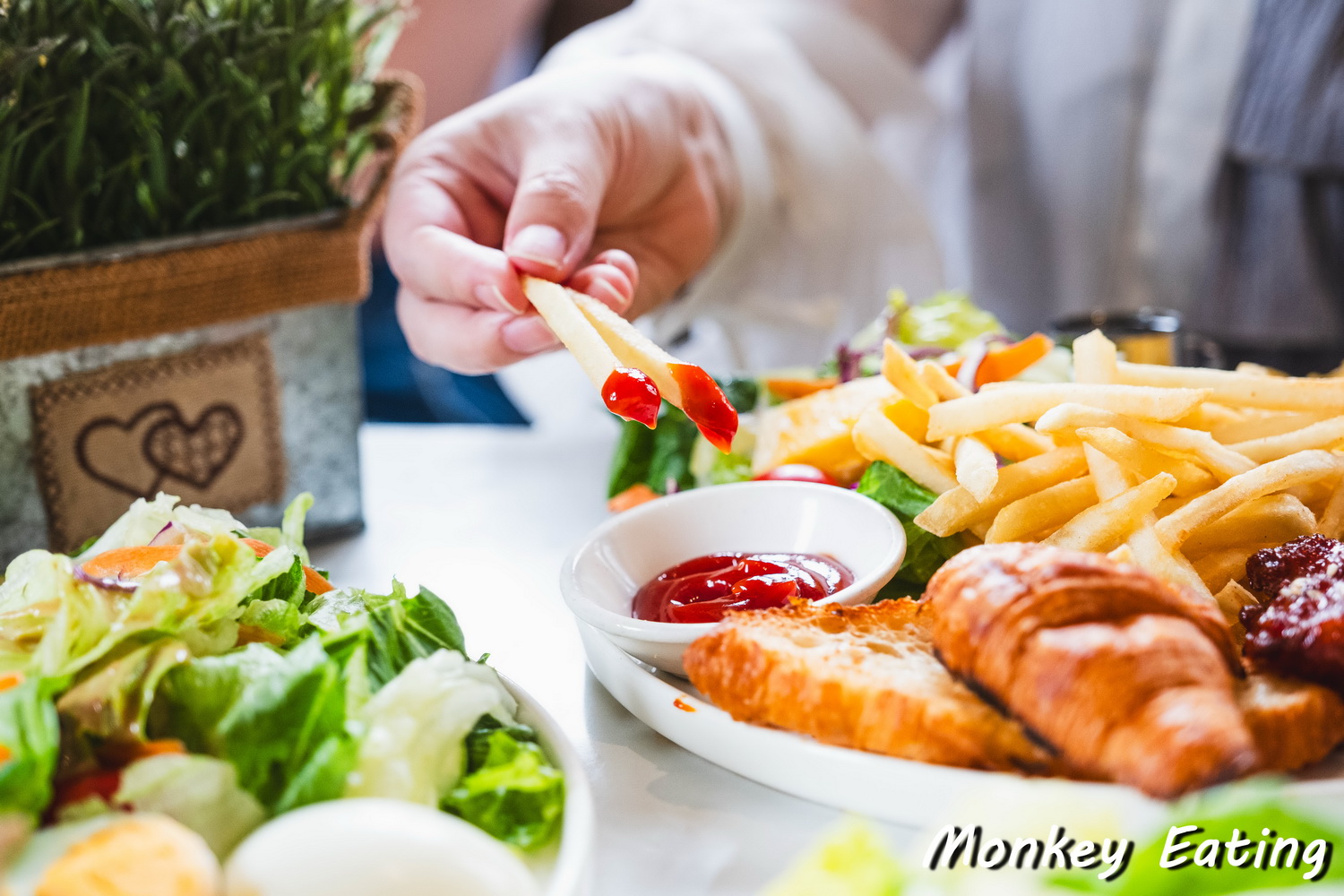 薯條炸得金黃酥脆、沙拉新鮮又有彩度,搭配水果點綴,整盤顏色非常繽紛誘人。