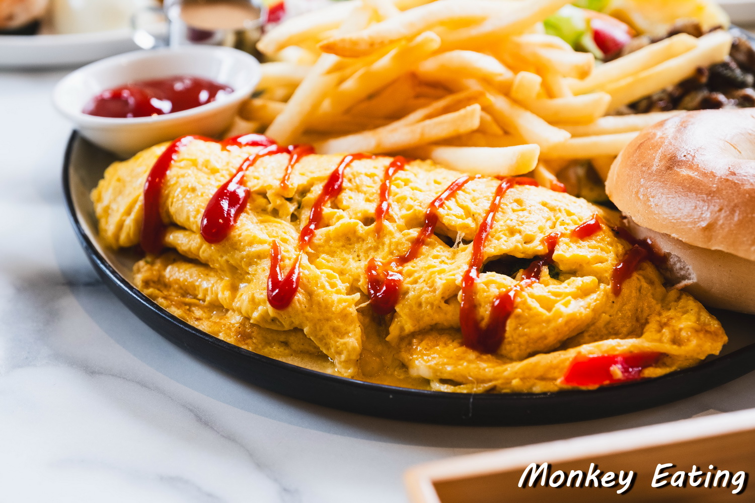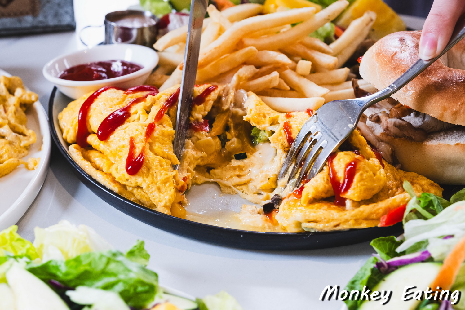 一切開就看到裡頭藏了滿滿的蔬菜,甜椒、洋蔥、菇菇…每口都有料。蛋皮滑嫩、裡頭多汁,加上番茄醬畫龍點睛,整個鹹香又帶點微甜,讓人一口接一口!