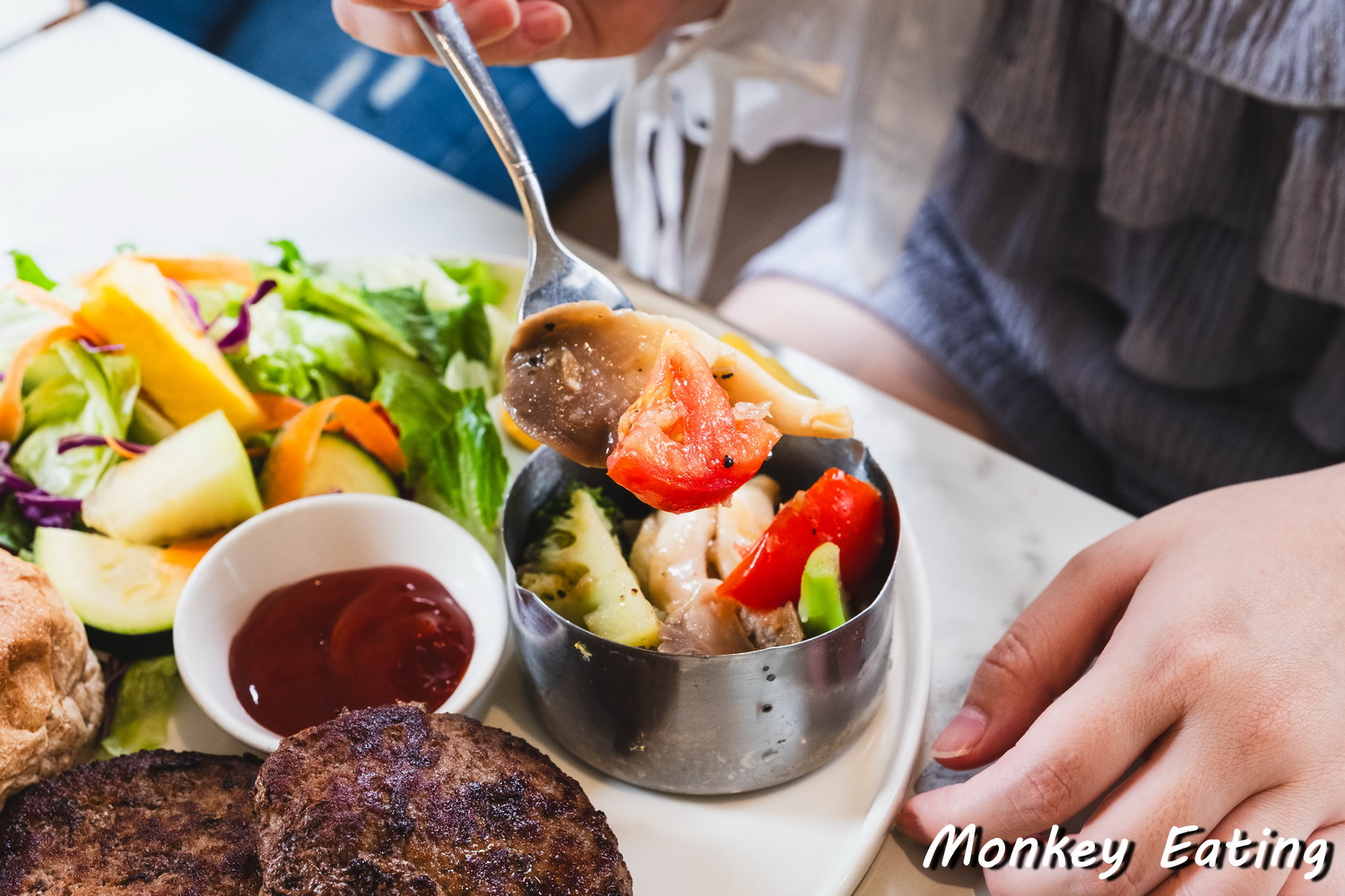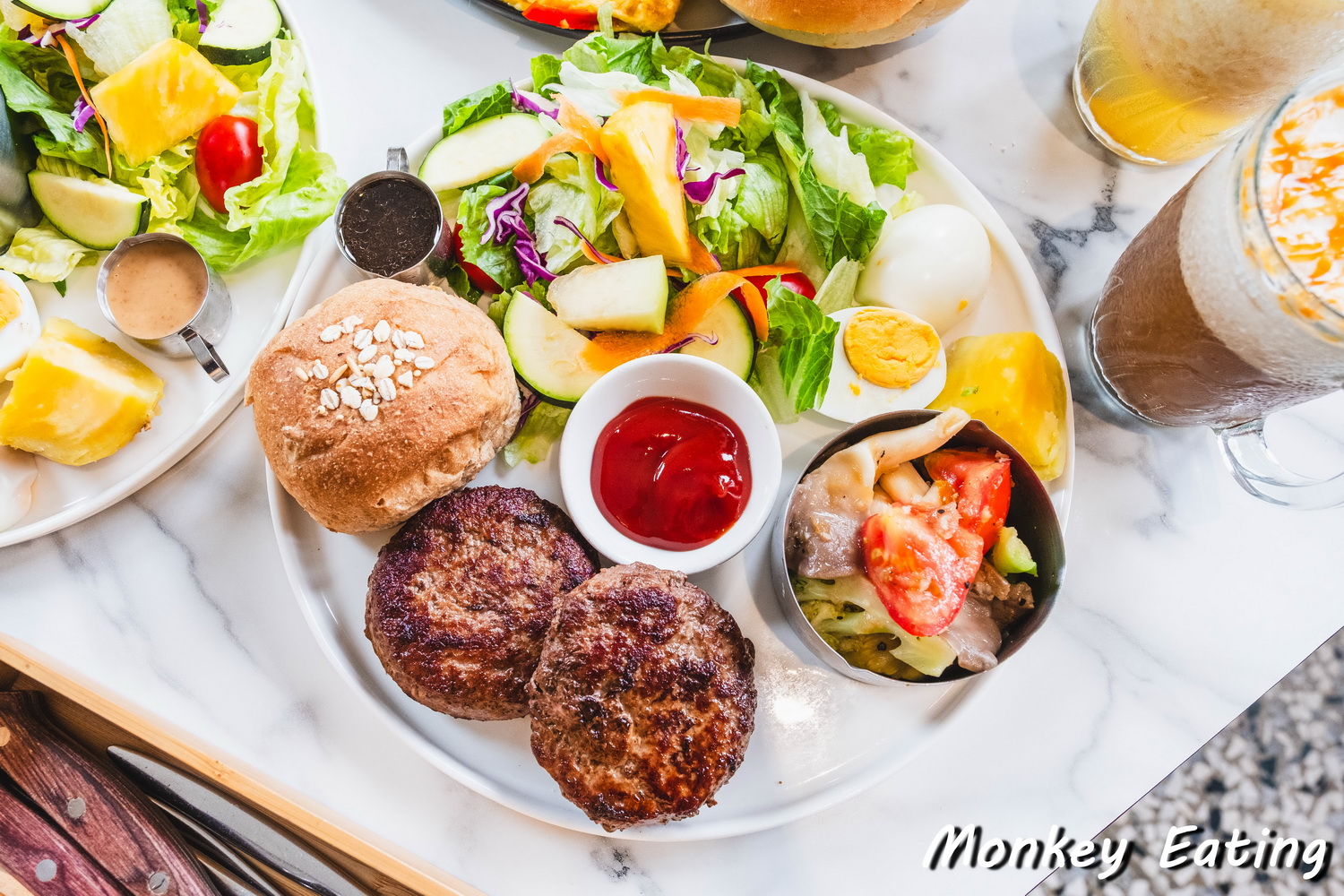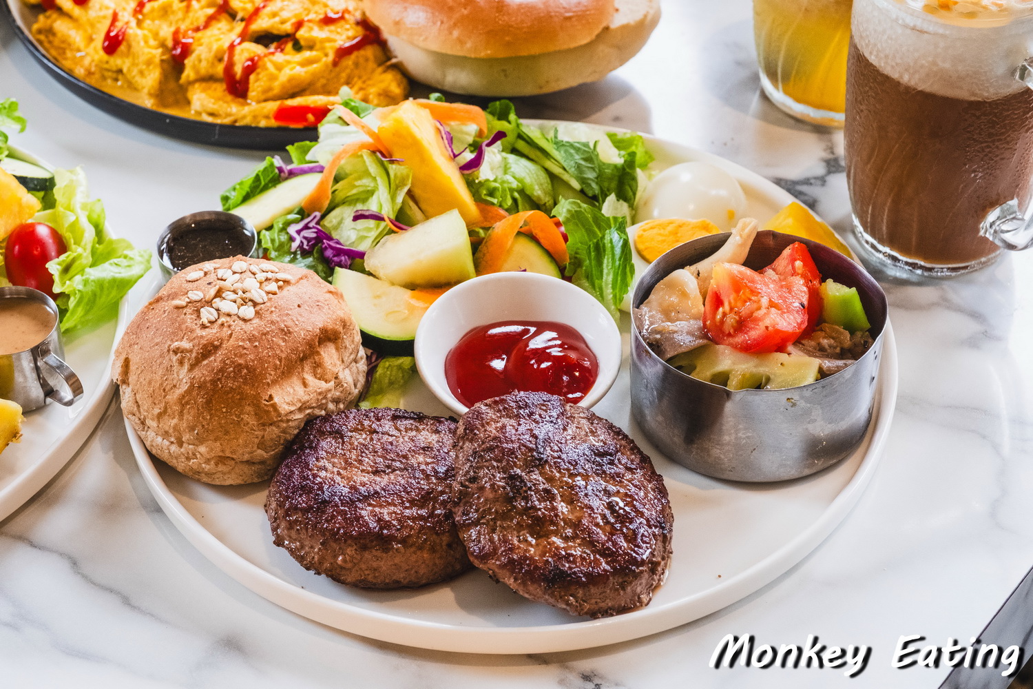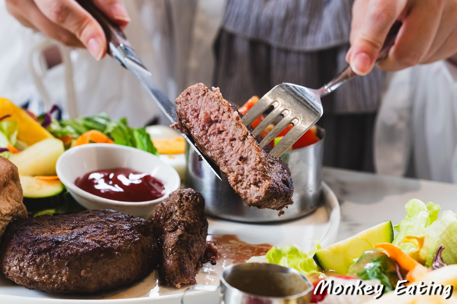 手打牛肉漢堡排,煎得香氣四溢、外酥內嫩,口感紮實、肉味濃郁,吃起來特別有滿足感。