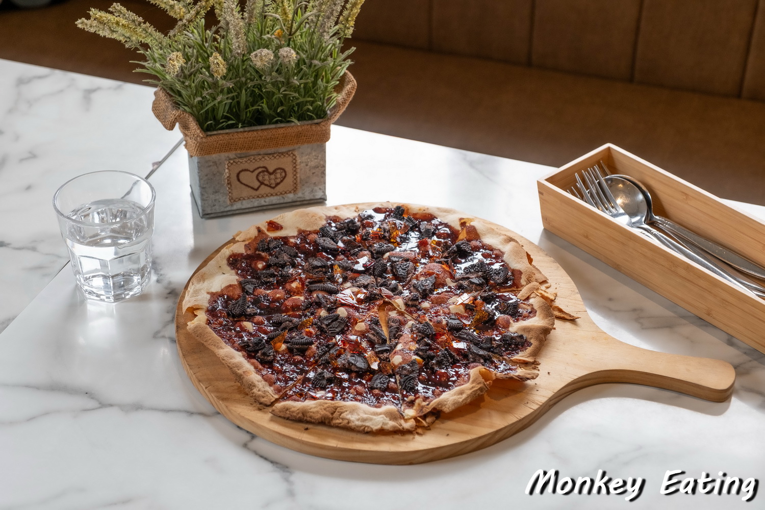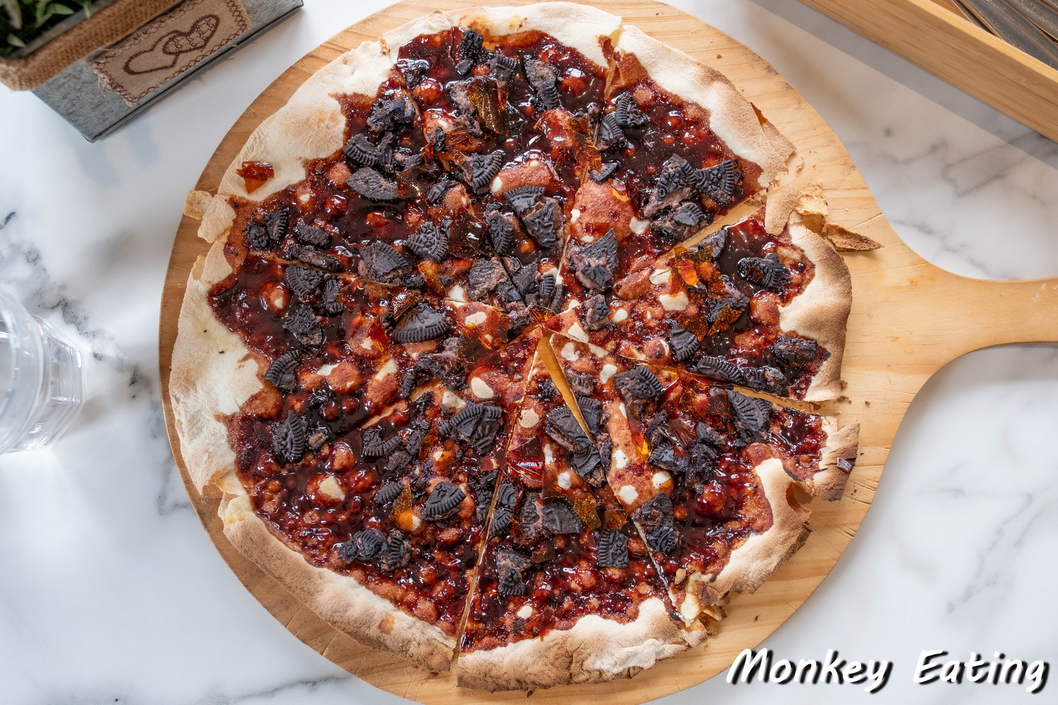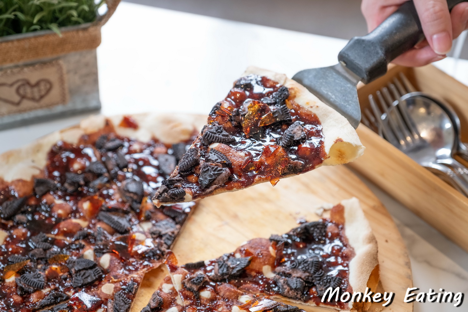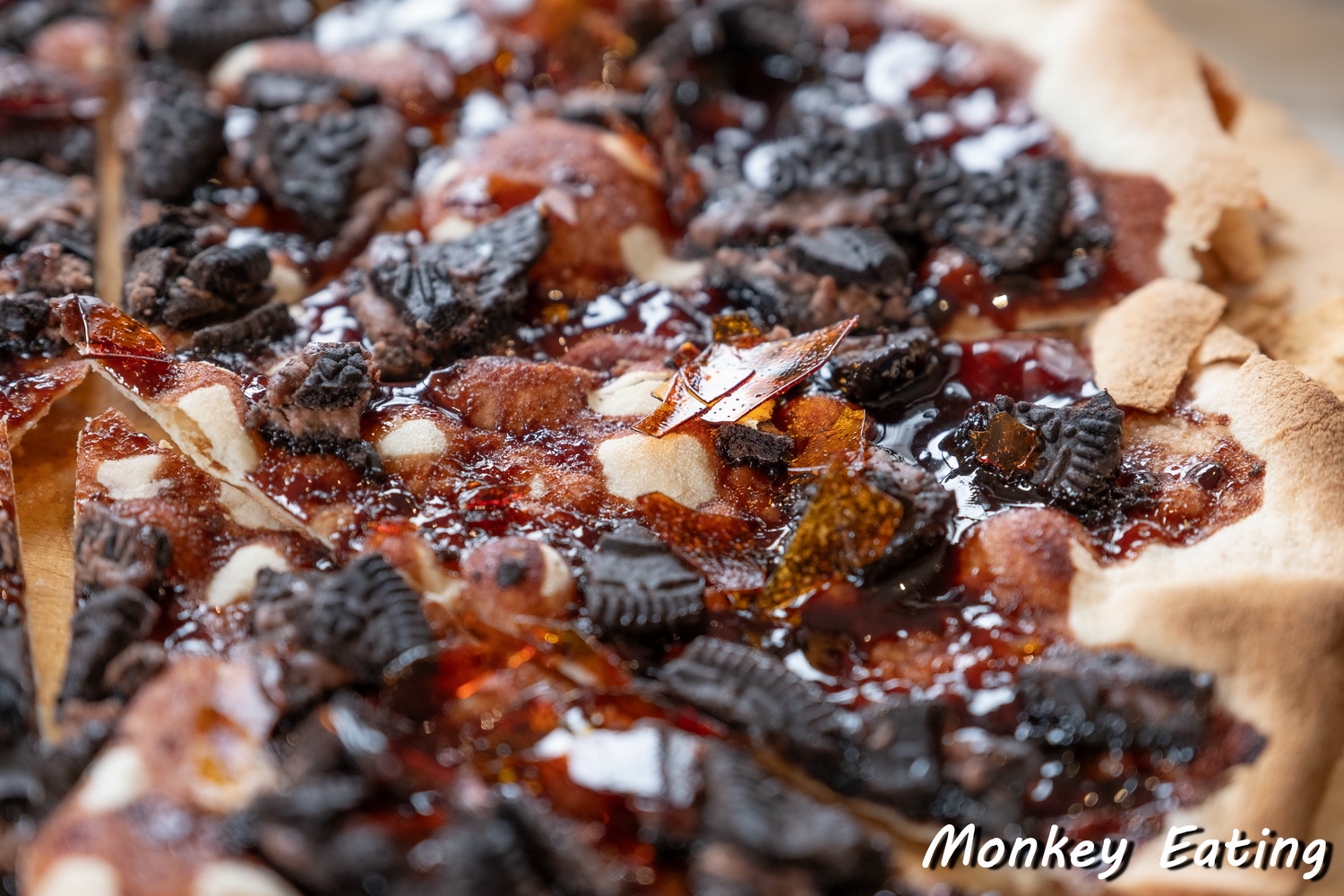 餅皮邊緣烤得酥酥的,上面鋪了厚厚一層濃郁的可可醬,還灑滿焦糖碎與OREO,出爐時整個香氣爆棚,真的讓人聞到就想立刻咬一口。
