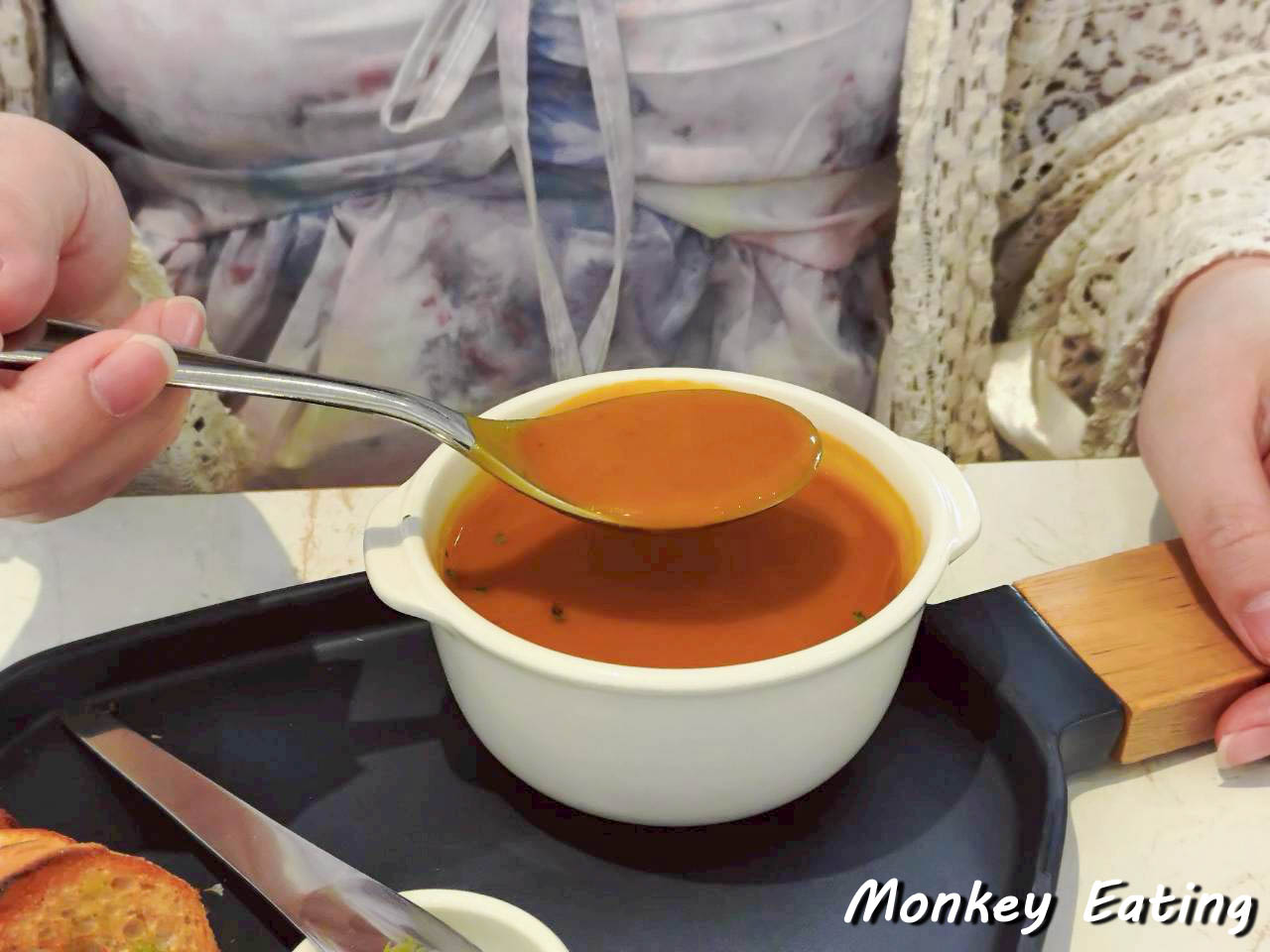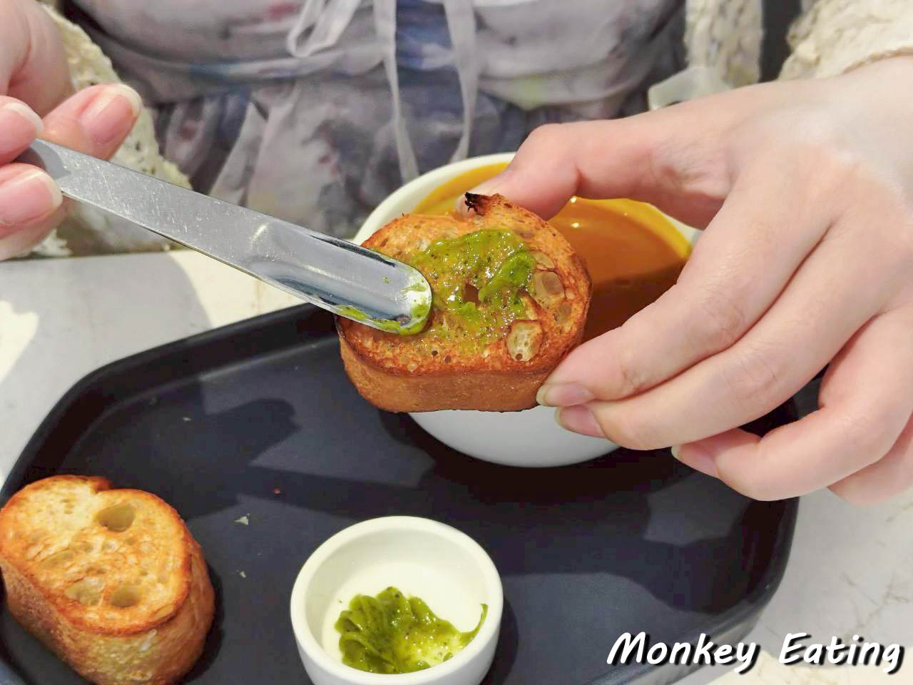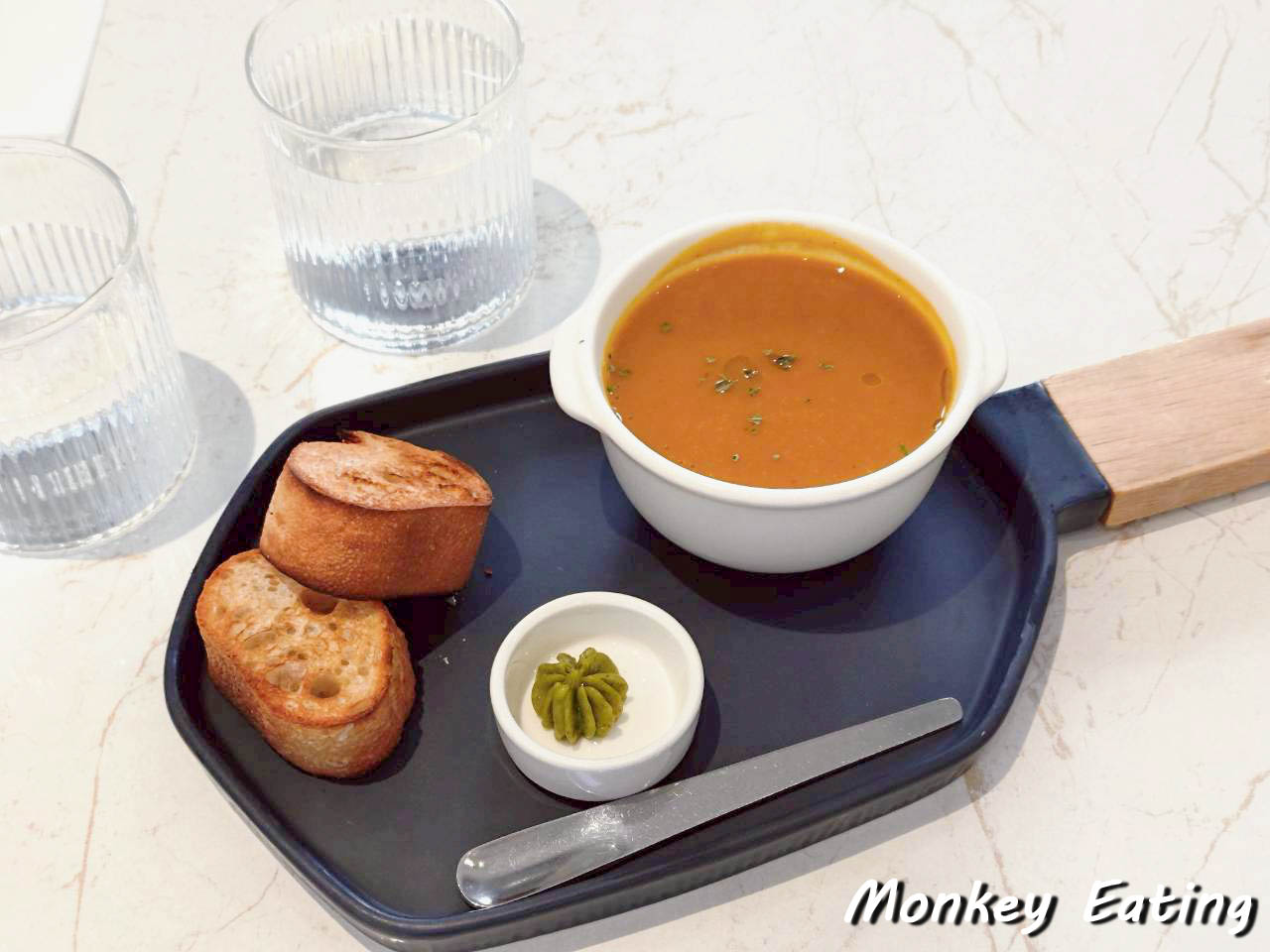 首先上桌的是套餐附贈的南瓜濃湯和法國麵包。南瓜濃湯喝起來口感綿密細緻,南瓜的香甜味非常濃郁,帶點辛香料的風味,暖呼呼地喝下一口,整個胃都暖起來了!而法國麵包則是烤得外層酥酥脆脆,沾著濃湯一起吃,風味更是一絕!