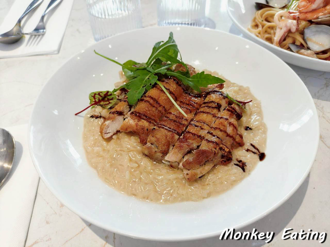 這道奶油白醬爐烤雞腿燉飯,光是視覺效果就已經超浮誇啦!一大隻金黃油亮的爐烤雞腿直接豪邁地擺在燉飯上,份量真的沒在跟你客氣!雞腿外皮烤得焦香酥脆,輕輕一劃開,裡面的雞肉水嫩水嫩,肉汁緩緩流出,香氣瞬間爆棚,聞到就想立刻咬一口!雞肉吃起來軟嫩多汁,完全不乾柴,搭配著濃郁的奶油白醬燉飯一起入口,真是人間美味。