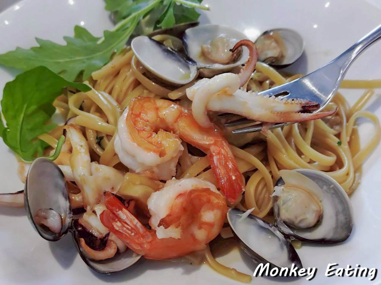 身為海鮮控的我,看到這盤蒜香海鮮義大利麵上桌時,眼睛都亮了!滿滿的蝦子、蛤蜊、花枝等新鮮海味鋪滿在義大利麵上,光看就覺得滿足!這道義大利麵以清炒蒜香為基底,將海鮮的鮮甜味完全提出,香氣撲鼻,讓人食指大動。