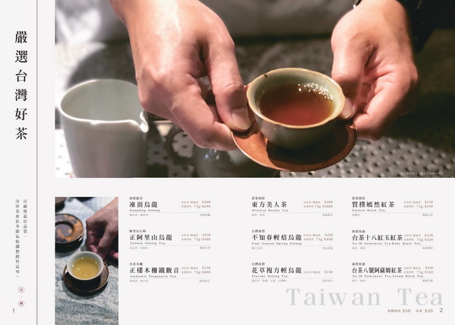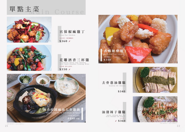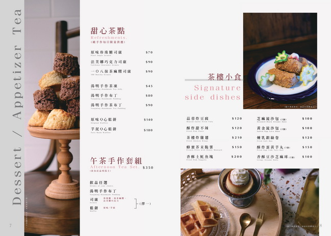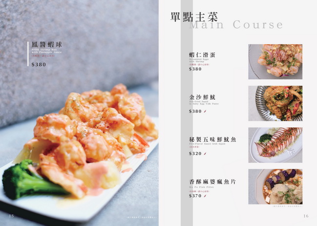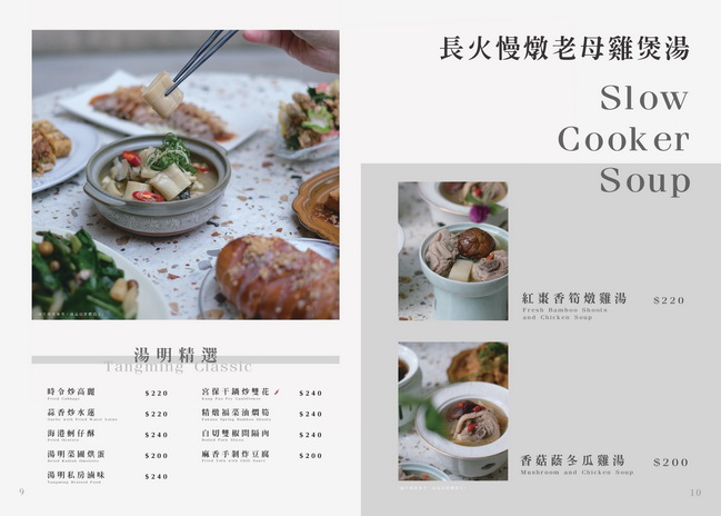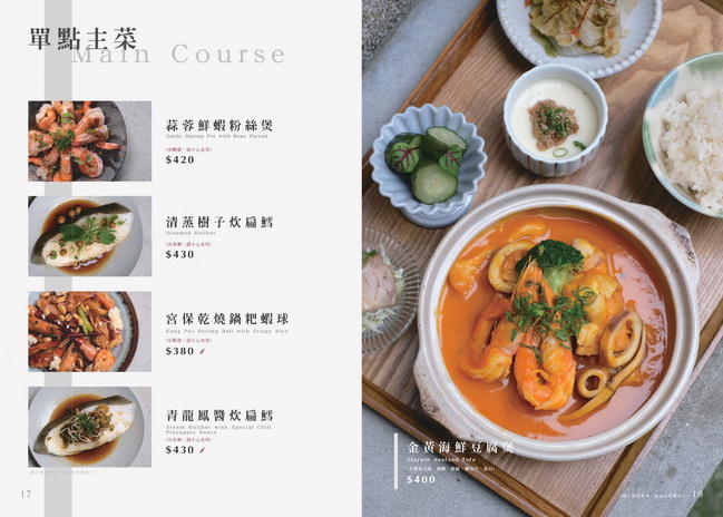 湯明茶樓的菜單設計得非常有質感,品項也超級豐富!主打各式經典台菜,但又加入了一些創意的元素,讓傳統美味有了新風貌。主餐類有肉類、海鮮、蔬菜等多種選擇,單點價位約落在320-470元之間。